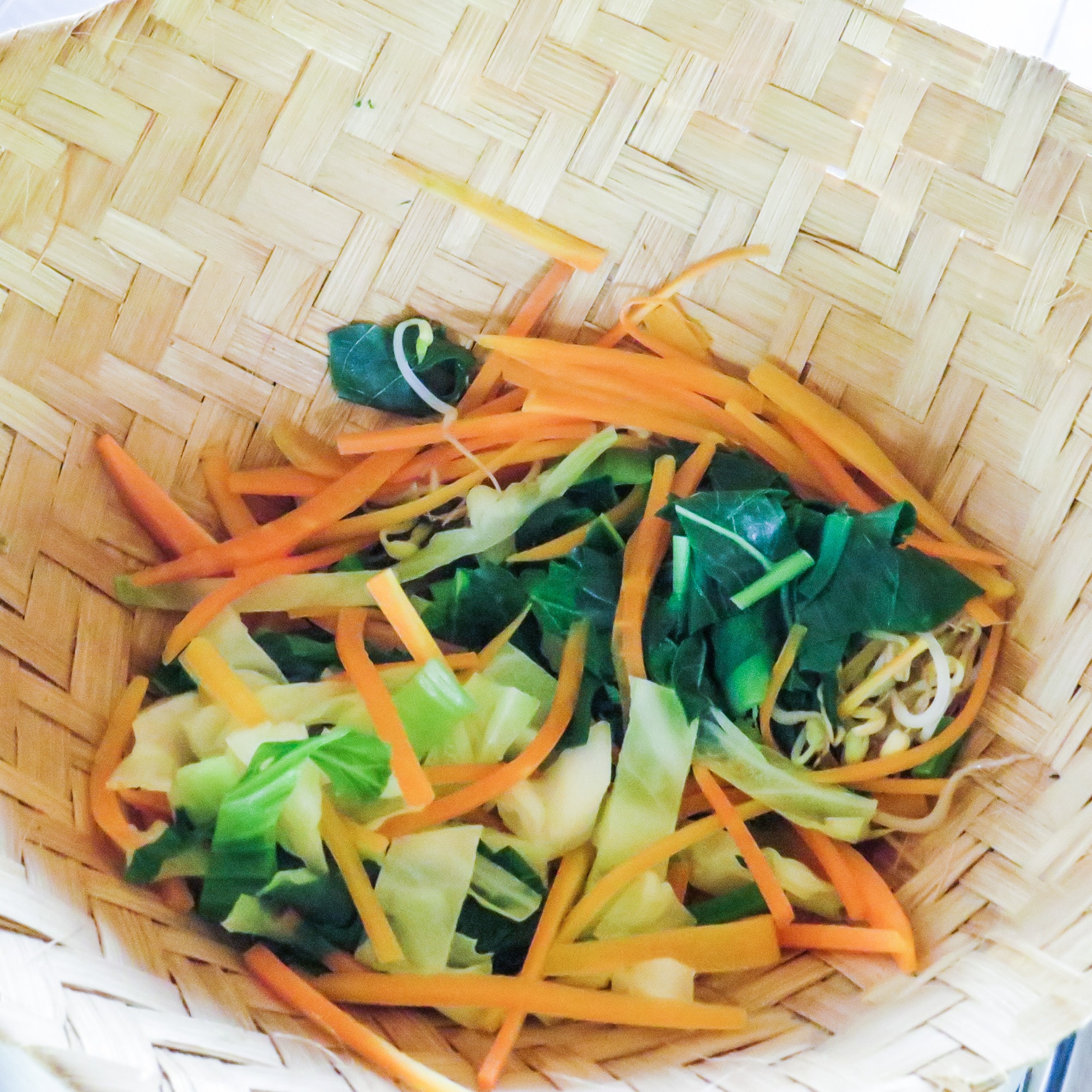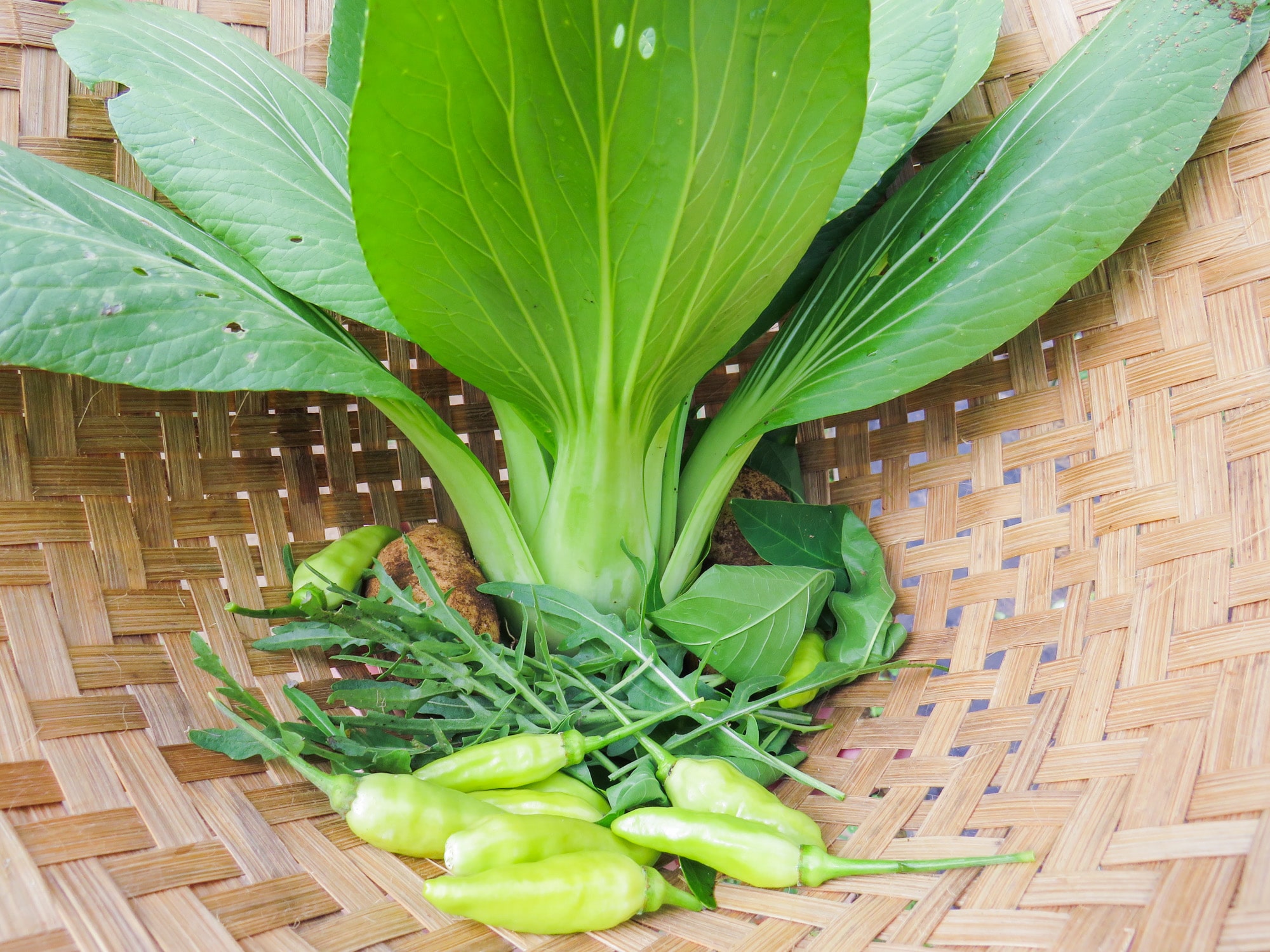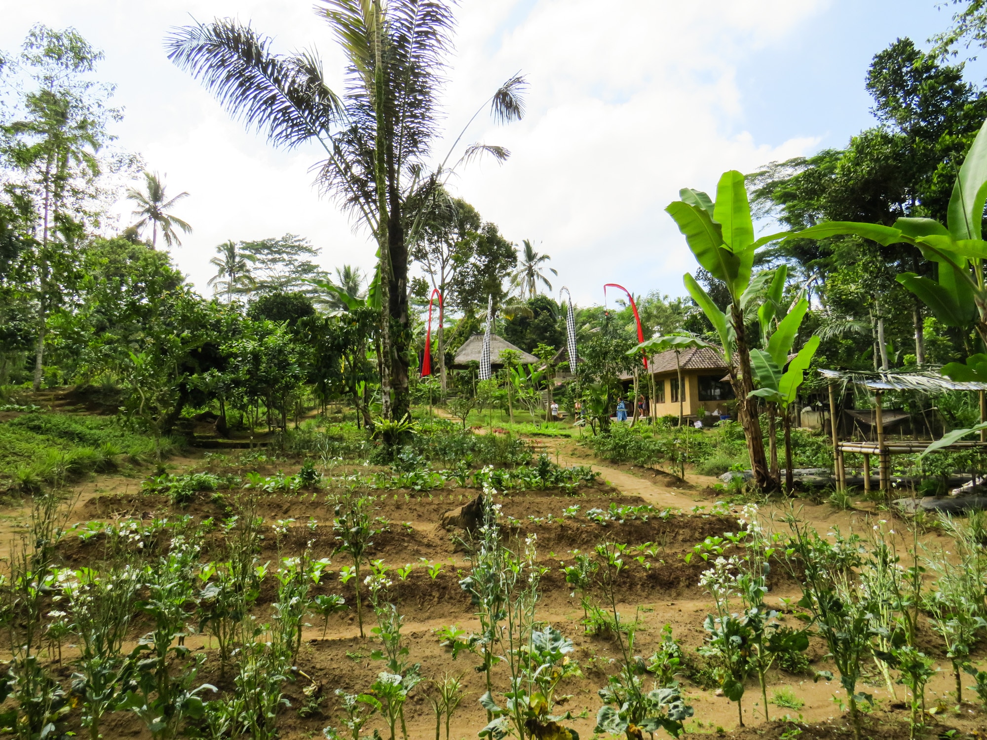 Nach dem Besuch eines traditionellen Marktes am frühen Morgen (Details und viele bunte Fotos gibt es hier zu sehen) trafen wir bei der Kochschule inmitten einer Biofarm ein. Nach einer kalten Erfrischung ging es los mit einer Tour durch die liebevoll angelegte und gut gepflegte Farm. Dabei sammelten wir gleich Kräuter und Gemüse, die wir später für die Zubereitung unserer Gerichte benötigen würden. An den teilweise ziemlich durchlöcherten Blättern konnte man ganz klar erkennen, dass es sich hier um rein biologischen Anbau handeln muss. Unser Guide bestätigte uns, dass auf jegliche Chemikalien verzichtet wird und dies bei den meisten Bauern auf Bali noch der Fall sei.