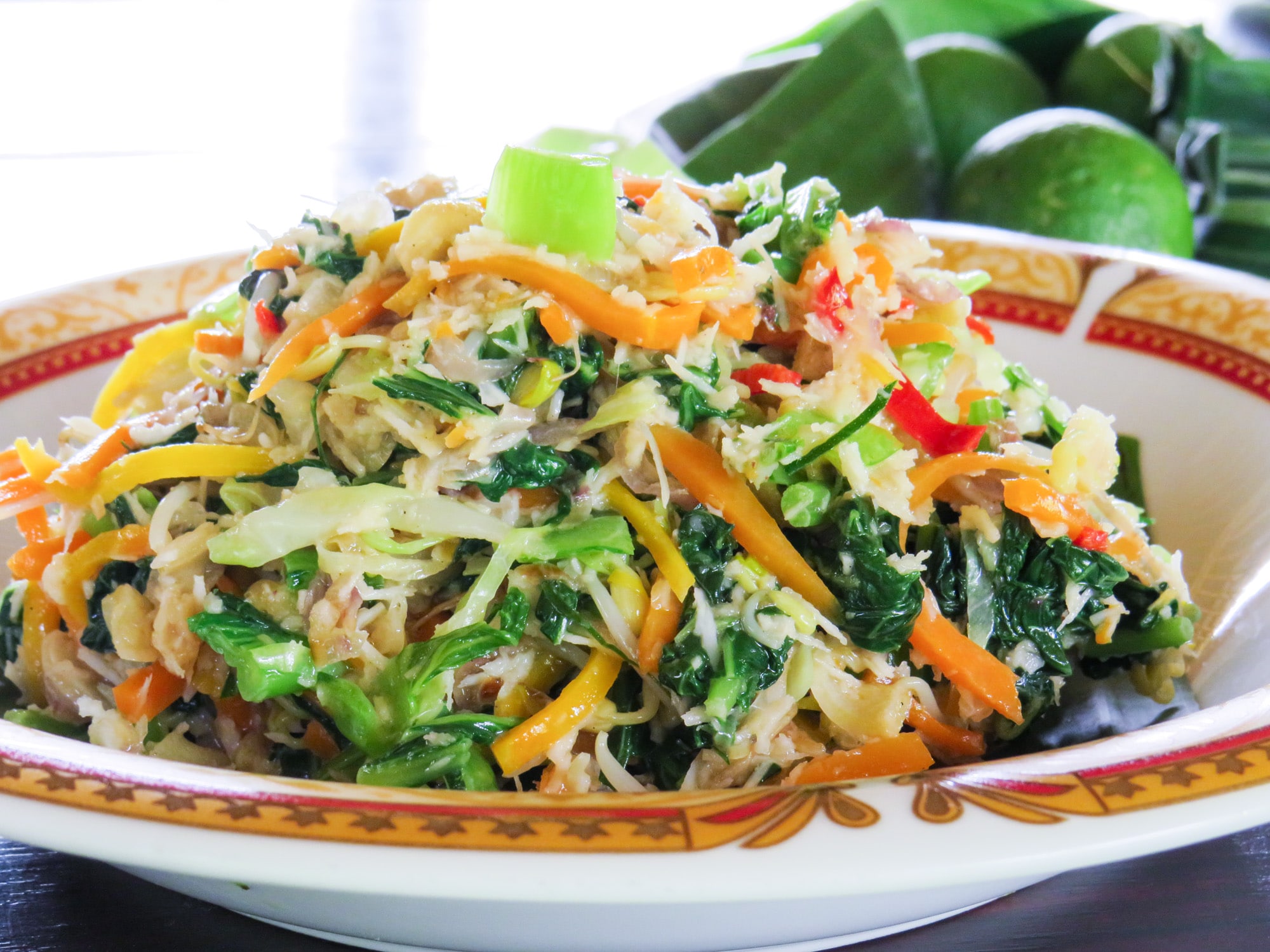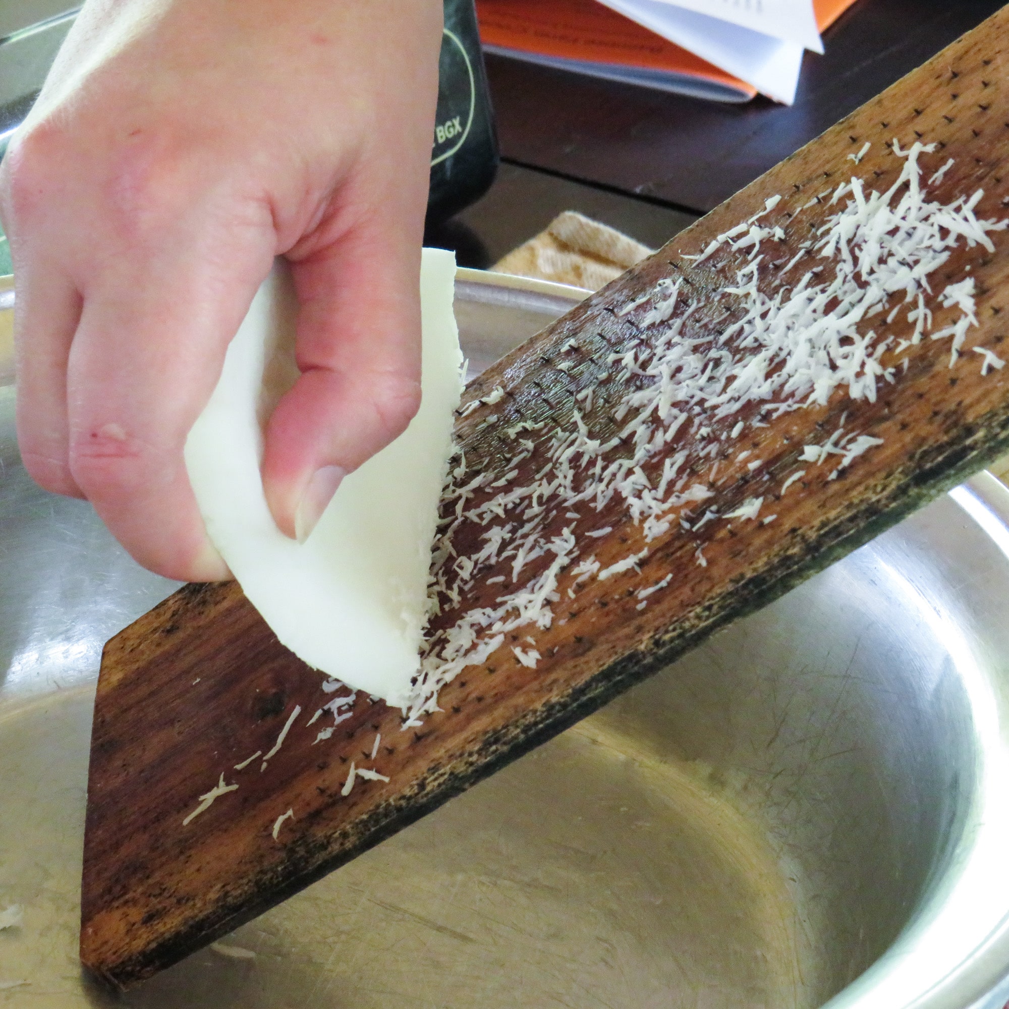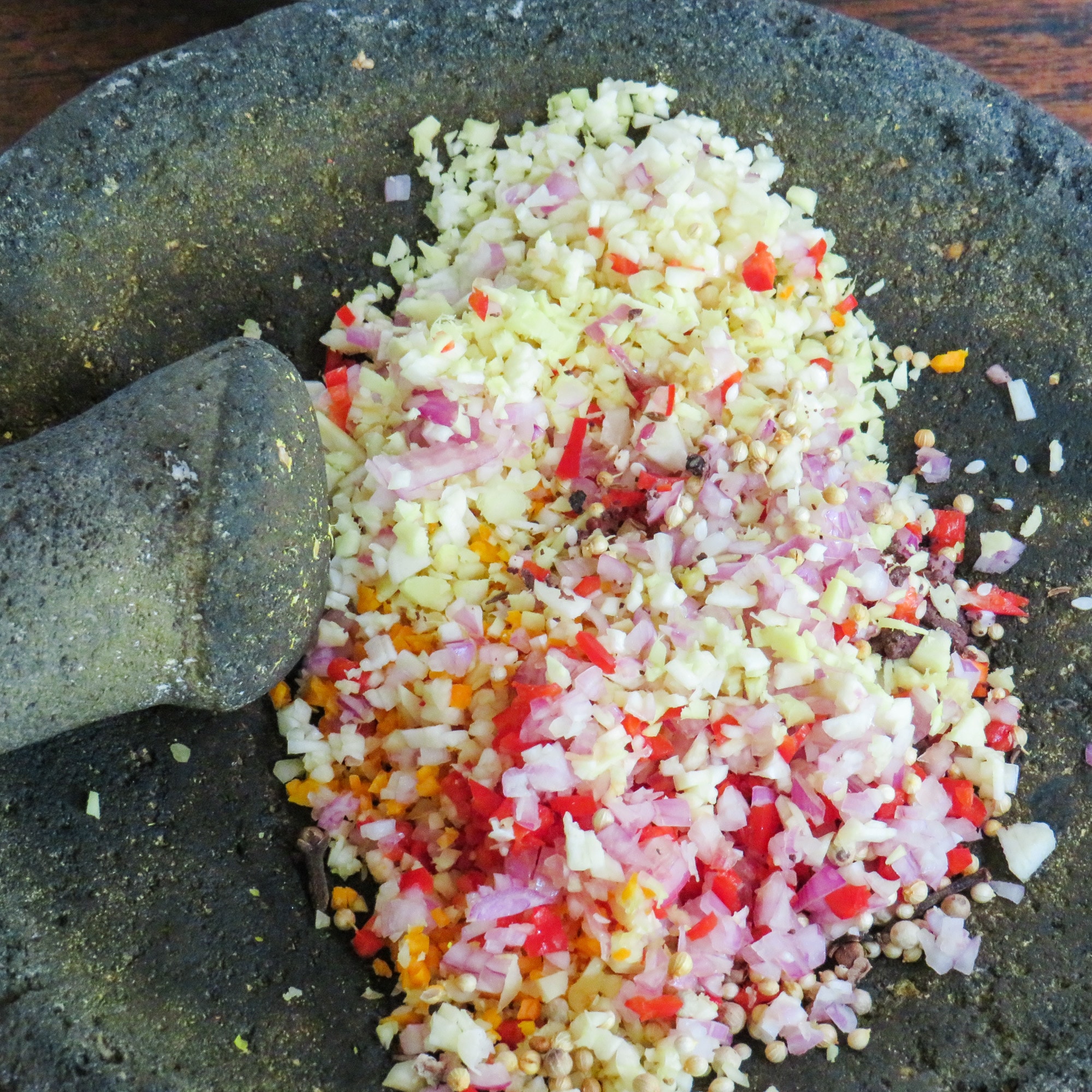 Nachdem wir die ersten beiden Gerichte verzehrt hatten, ging es weiter mit der Herstellung der Gewürzpaste Bumbu Bali, die bei sehr vielen Speisen zum Einsatz kommt. Sie besteht aus Galangal, Kurkuma, Ingwer, Schalotten, Knoblauch, roten Chilischoten, Garnelenpaste, Lemongrass und Kokosöl. Traditionell wird für die Zubereitung ein Mörser aus Vulkanstein verwendet.