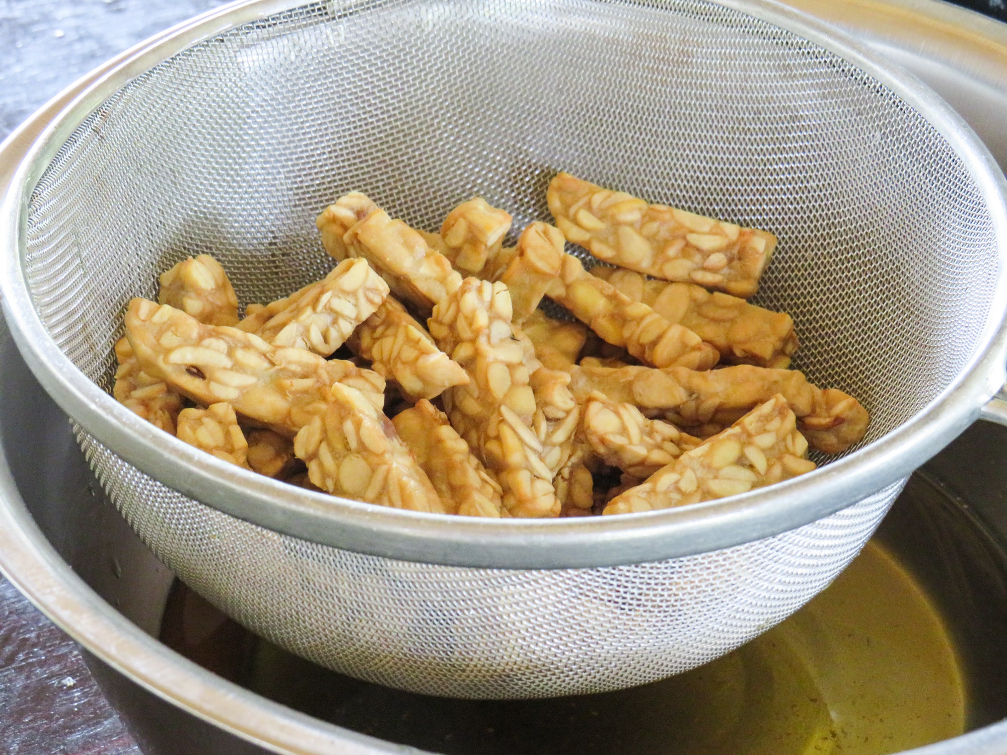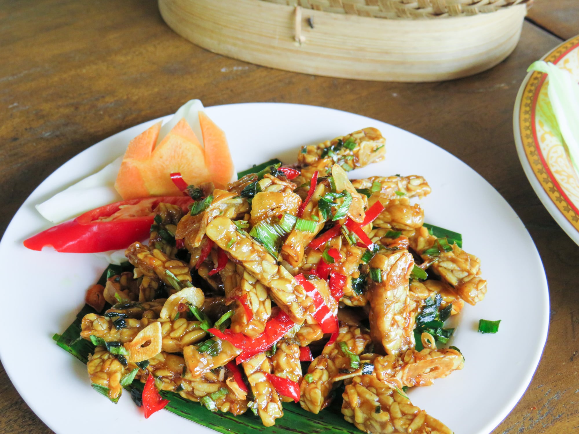 Dann ging es endlich ans Kochen! Wir wurden jeweils zu zweit einer Kochstation zugeteilt. Die Zutaten für die ersten Gericht waren bereits von den zahlreichen fleißigen Bienen im Hintergrund vorbereitet. Zu Beginn kochten wir Sayur Urab, was soviel bedeutet wie gemischtes Gemüse, und Sweet Sour Tempe. Tempe (bei uns meist Tempeh geschrieben) ist ein Produkt aus fermentierten und gekochten Sojabohnen, das in Indonesien sehr gerne gegessen wird. Beide Gerichte haben mir wirklich ausgesprochen gut geschmeckt!