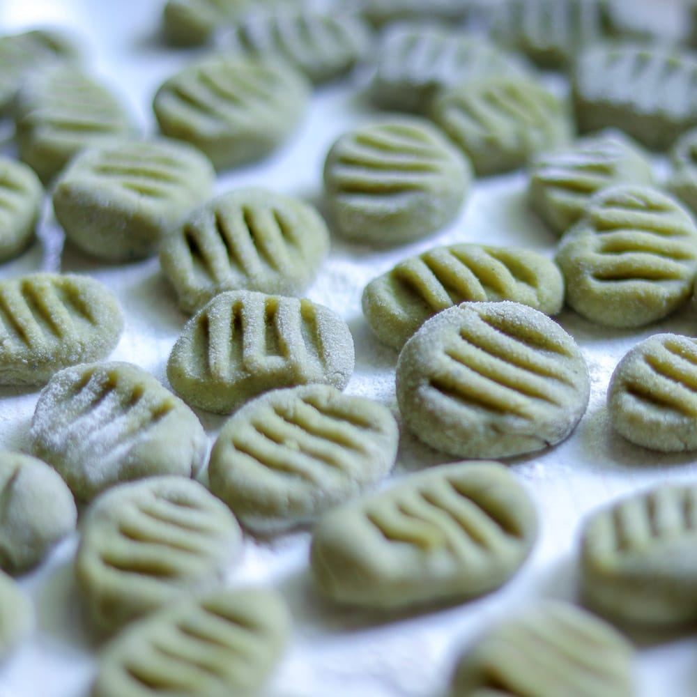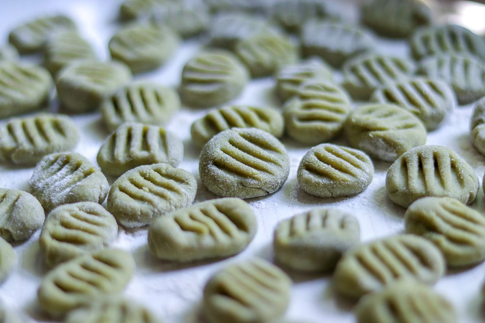 5. Aus dem Erdäpfelteig mehrere Rollen mit ca. 2 cm Durchmesser formen. Mit einem scharfen Messer in Scheiben schneiden (ca. 1,5 cm Abstand). Aus den einzelnen Teigstücken kleine Nockerl formen und mit einer Gabel die typischen Gnocchirillen eindrücken.