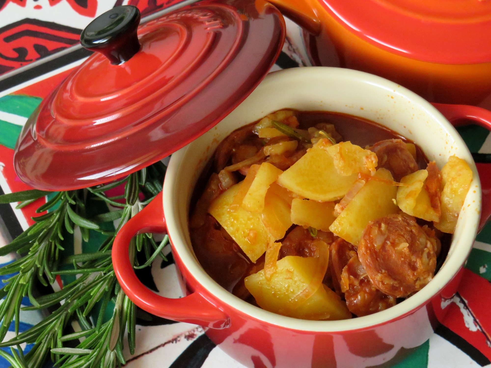 Die Erdäpfel schälen und in grobe Würfel schneiden. Chorizo in Scheiben und Zwiebeln in feine Ringe schneiden. In einem großen Topf Olivenöl erhitzen und Zwiebel darin rösten. Paprikapulver und Paprikamark hinzugeben und kurz mitrösten. Mit einem Schuss Essig ablöschen und kurz warten bis er verdunstet ist. Danach Rindsuppe, Erdäpfel, einige Rosmarinzweige und die Lorbeerblätter hinzugeben. Das Ganze ca. eine Stunde köcheln lassen. Gegen Ende zerdrücke ich dann einige Erdäpfelstücke mit einer Gabel damit der Eintopf noch ein bisschen eindickt.