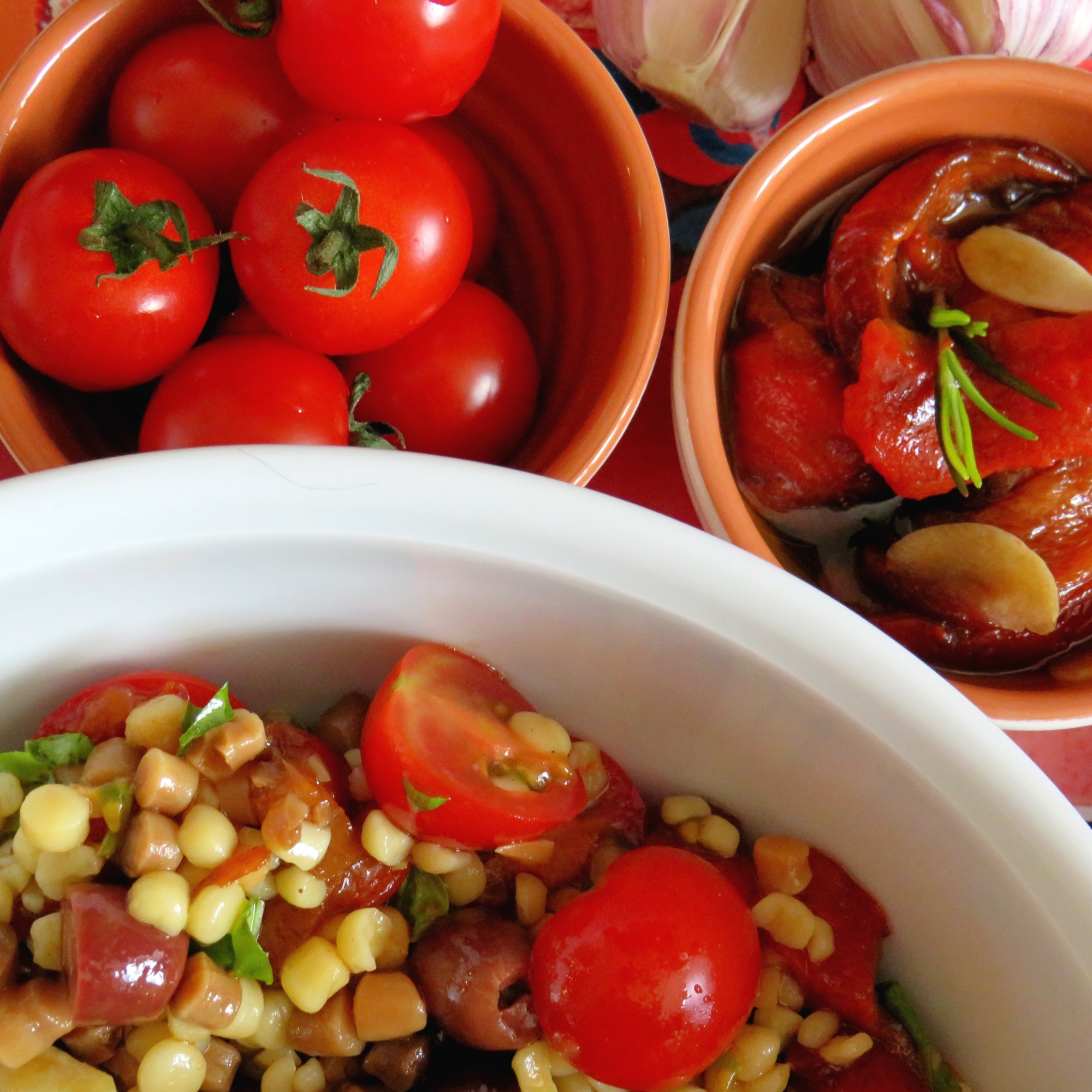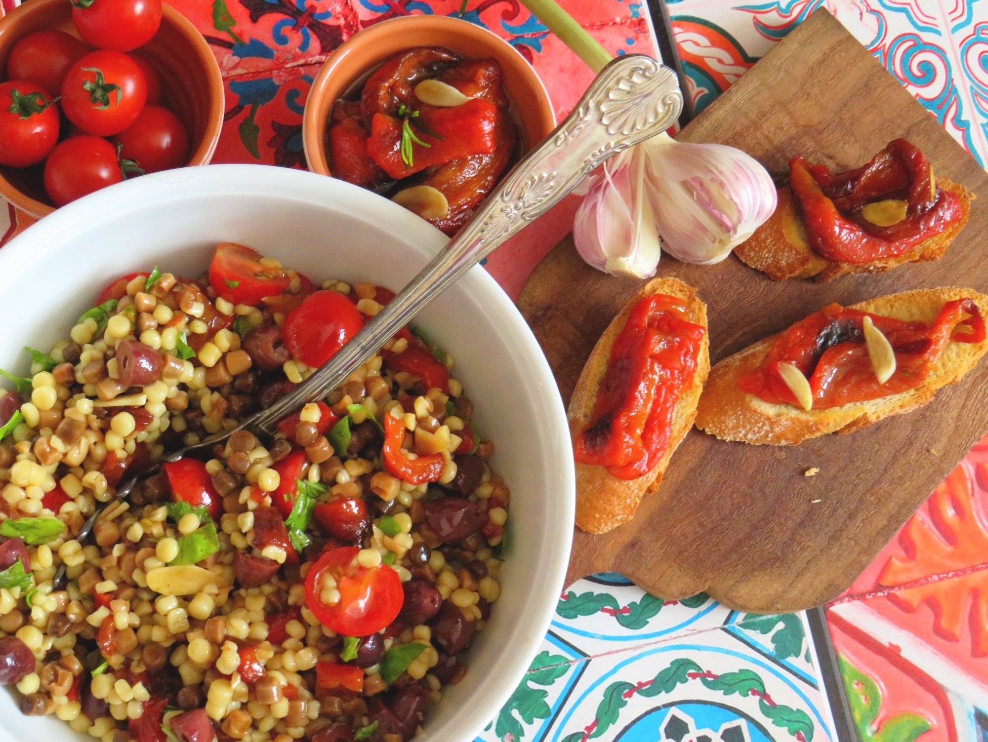 Pasta Fregola laut Packungsanleitung kochen und auskühlen lassen. Cherrytomaten und Oliven halbieren und Basilikum grob hacken. Die eingelegten gegrillten Paprika klein schneiden. Alles mit der Pasta gut vermischen. Die Marinade der eingelegten Paprika über den Salat gießen und mit Zitronensaft, Salz und Pfeffer abschmecken.