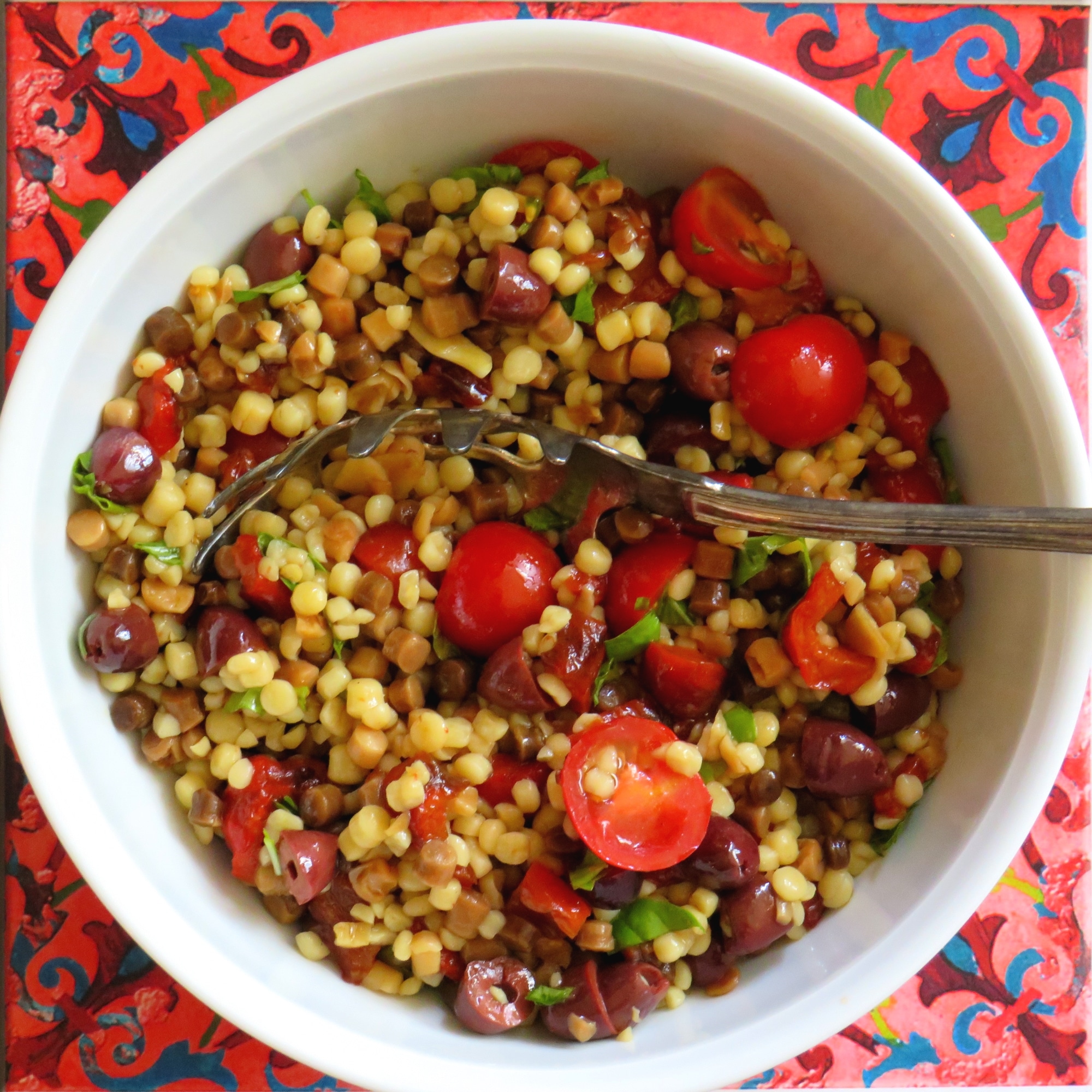 Kleine Pastasorten wie Farfalle oder Fusilli eignen sich besonders gut für den Salat. Ich habe diesmal Fregola verwendet. Das ist eine Pastaspezialität aus Sardinien, die aus Hartweizengries hergestellt wird und ihren typischen Geschmack durch Rösten der Pastakügelchen im Backofen bekommt. Ein weiteres Rezept mit Pasta Fregola, Fregola con verdure – Sardinische Pasta mit Ofengemüse, findet ihr hier.