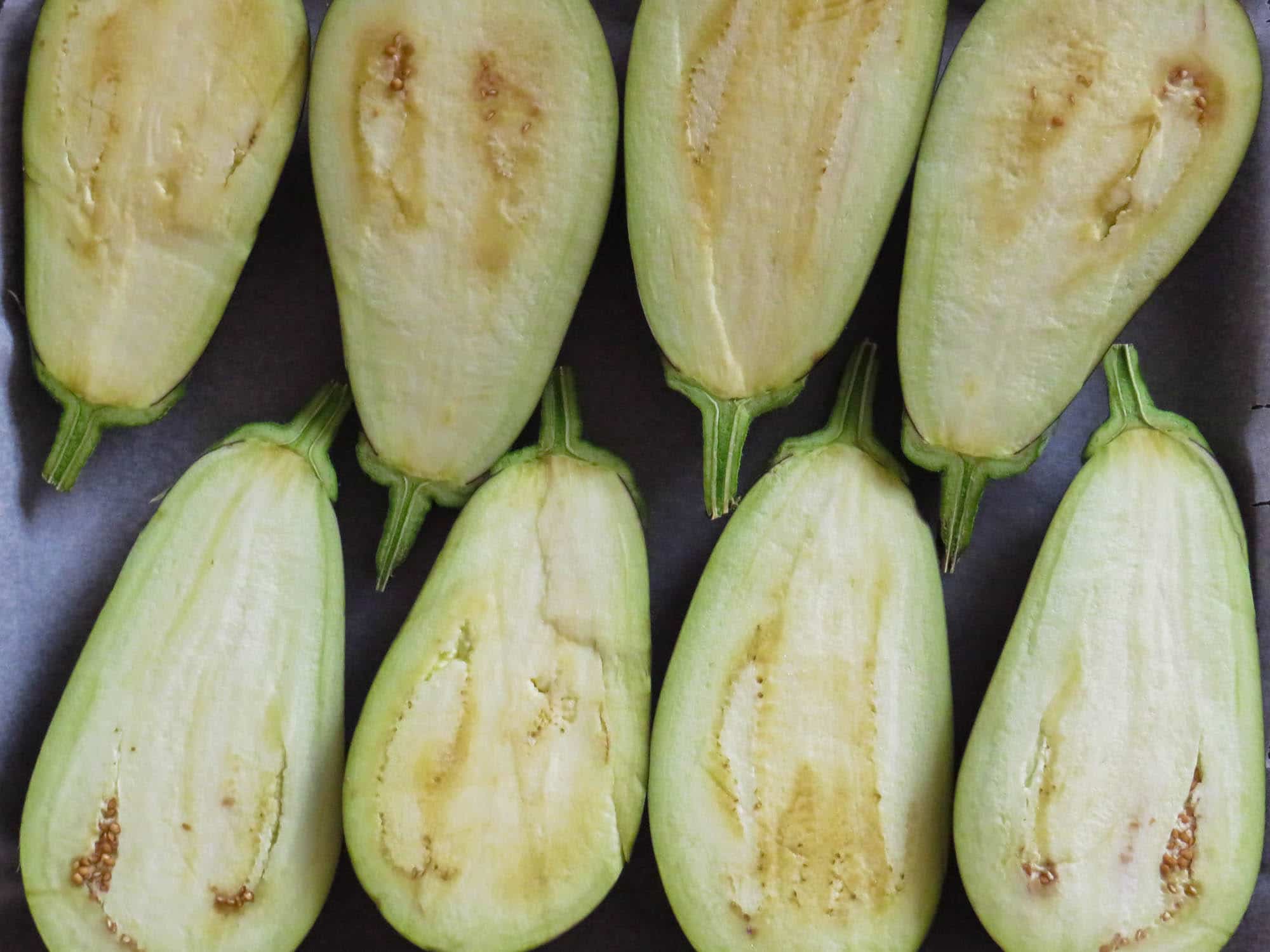 - 4 große Melanzani (Auberginen), der Länge nach halbiert