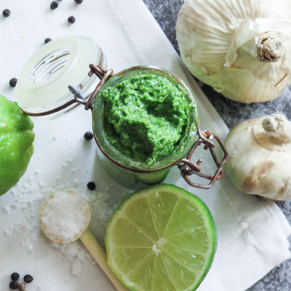 Inzwischen wird das Pesto zubereitet. Dafür alle Zutaten in die Küchenmaschine geben und fein pürieren. Wenn die Konsistenz zu trocken ist, noch etwas mehr Olivenöl und Limettensaft hinzugeben.