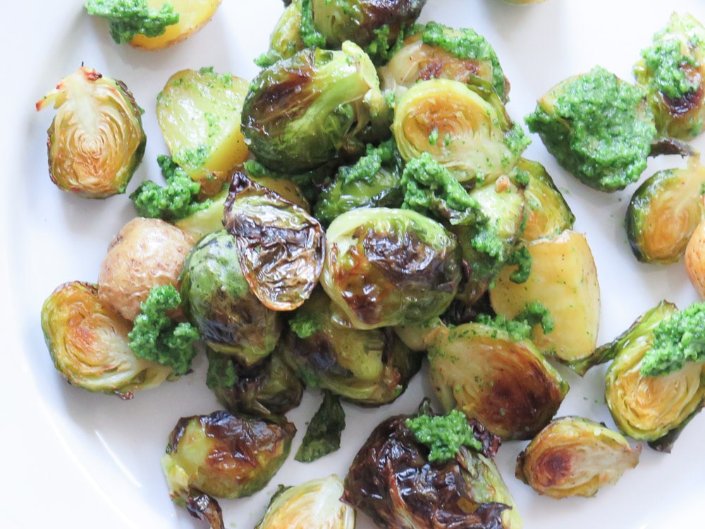 Geröstete Kohlsprossen und Kartoffeln aus dem Backrohr holen und noch heiß mit dem Pesto vermischen und servieren.