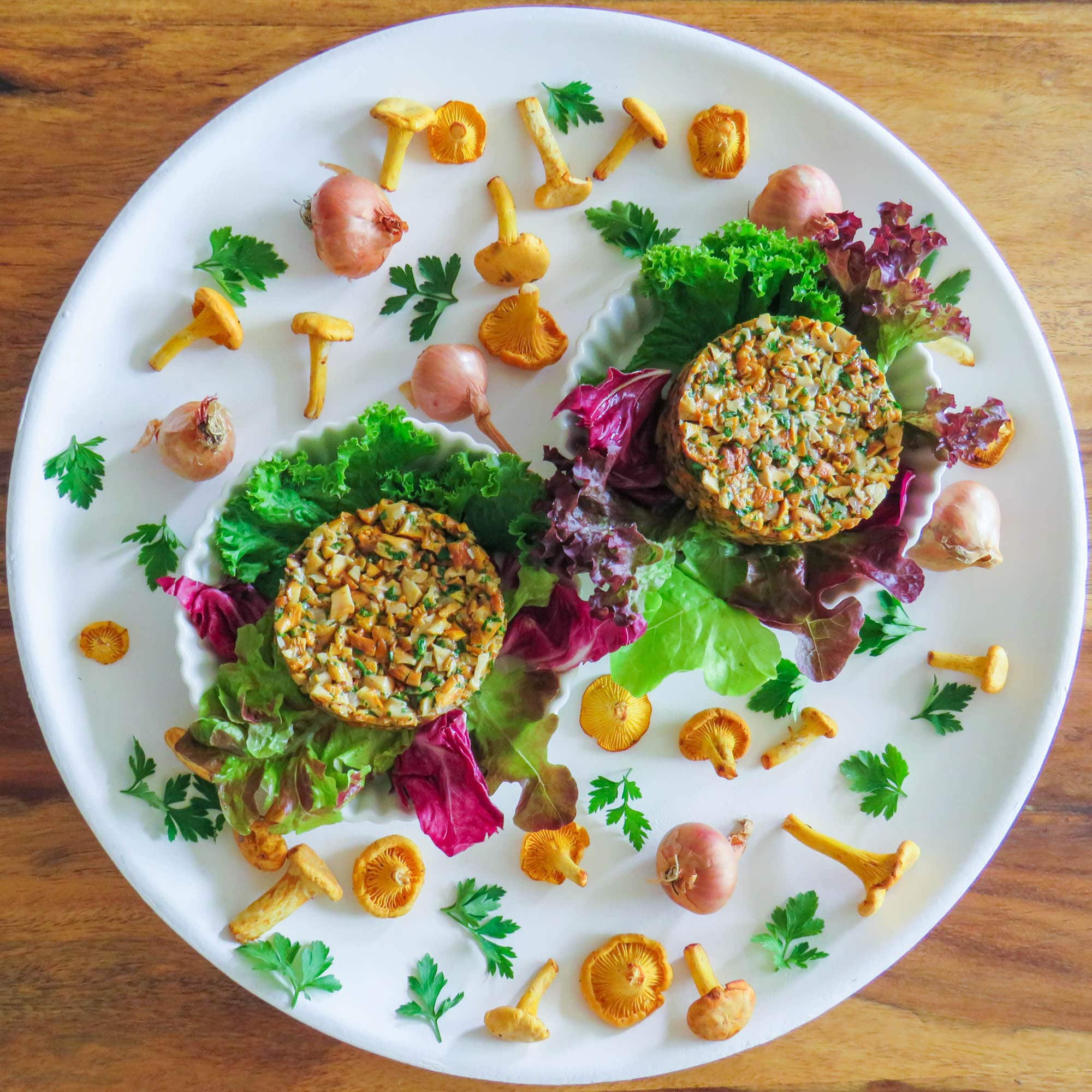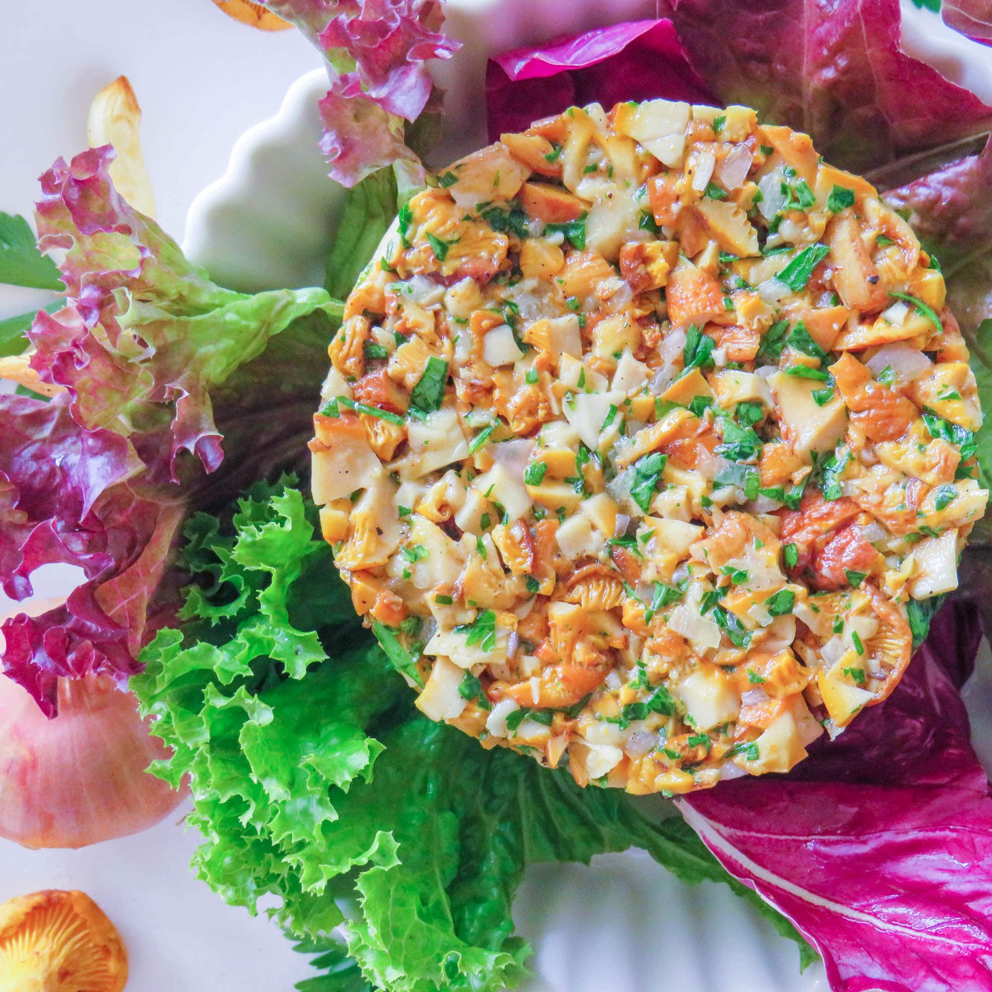 Das Eierschwammerltatar in einen Portionierring füllen, leicht andrücken und den Ring abheben. Das Tatar mit Salatblättern garniert anrichten.