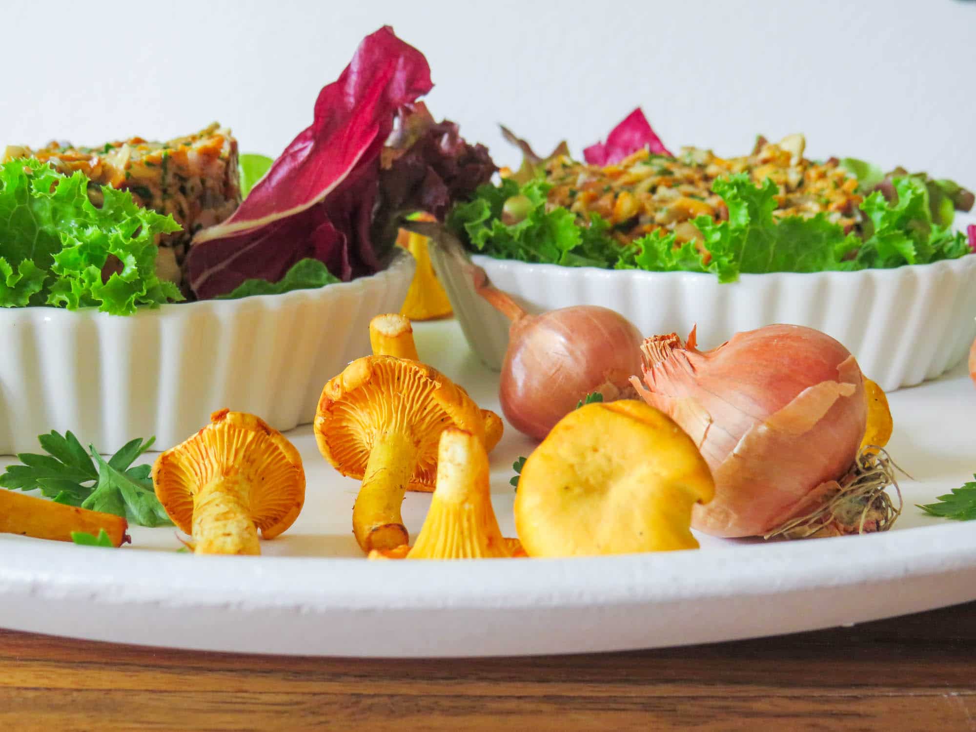 Die Klassiker sind natürlich Eierschwammerl-Risotto, Eierschwammerl-Gulasch oder ganz einfache geröstete Eierschwammerl aus der Pfanne. Als etwas raffiniertere Alternative dazu habe ich ein feines Eierschwammerltatar zubereitet. Mit der Kombination aus Eierschwammerl, frischer Petersilie und Schalotten kann man sowieso nie falsch liegen. Und mit einem Hauch Trüffelöl verfeinert schmeckt das Eierschwammerltatar wirklich köstlich! Ich habe das Gericht einfach auf etwas Blattsalat angerichtet, könnte es mir aber auch gut auf geröstetem Schwarzbrot vorstellen.