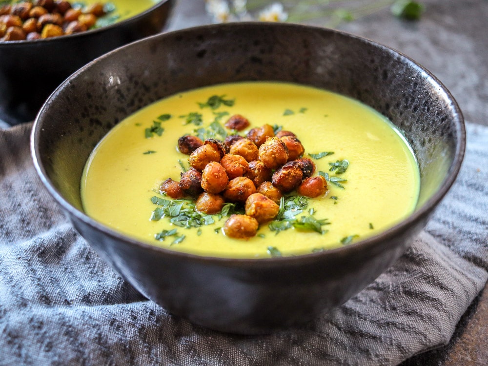 Diese Suppe aus Karfiol, Kurkuma und Cashews ist wie eine kuschelige Decke, die dich von Innen wärmt. Die gerösteten Masala Kichererbsen sind noch die perfekte Draufgabe zur Goldenen Suppe. Du kannst natürlich auch gleich mehr davon machen und sie als Topping für einen Salat oder eine Lunch Bowl verwenden.