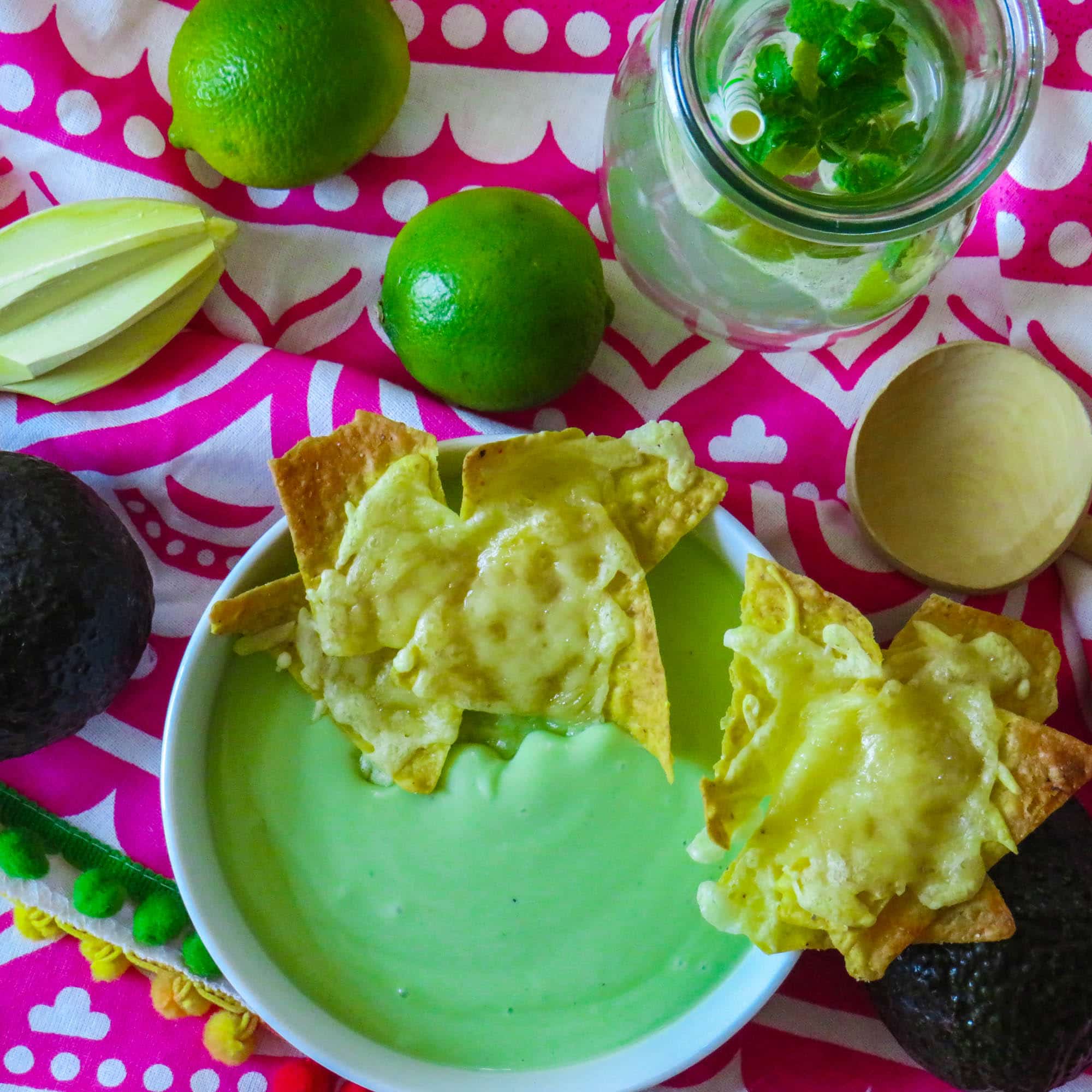 Das Backrohr auf 200 Grad Oberhitze vorheizen. Auf einem Blech mit Backpapier die Tortilla-Chips in kleinen Häufchen auflegen und großzügig mit Käse bestreuen. Für ca. 5 Minuten ins Rohr schieben, bis der Käse geschmolzen ist.