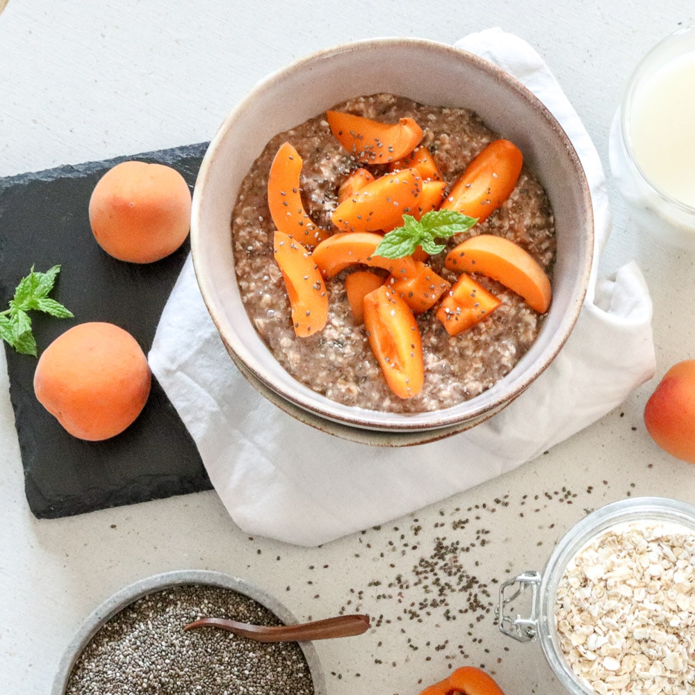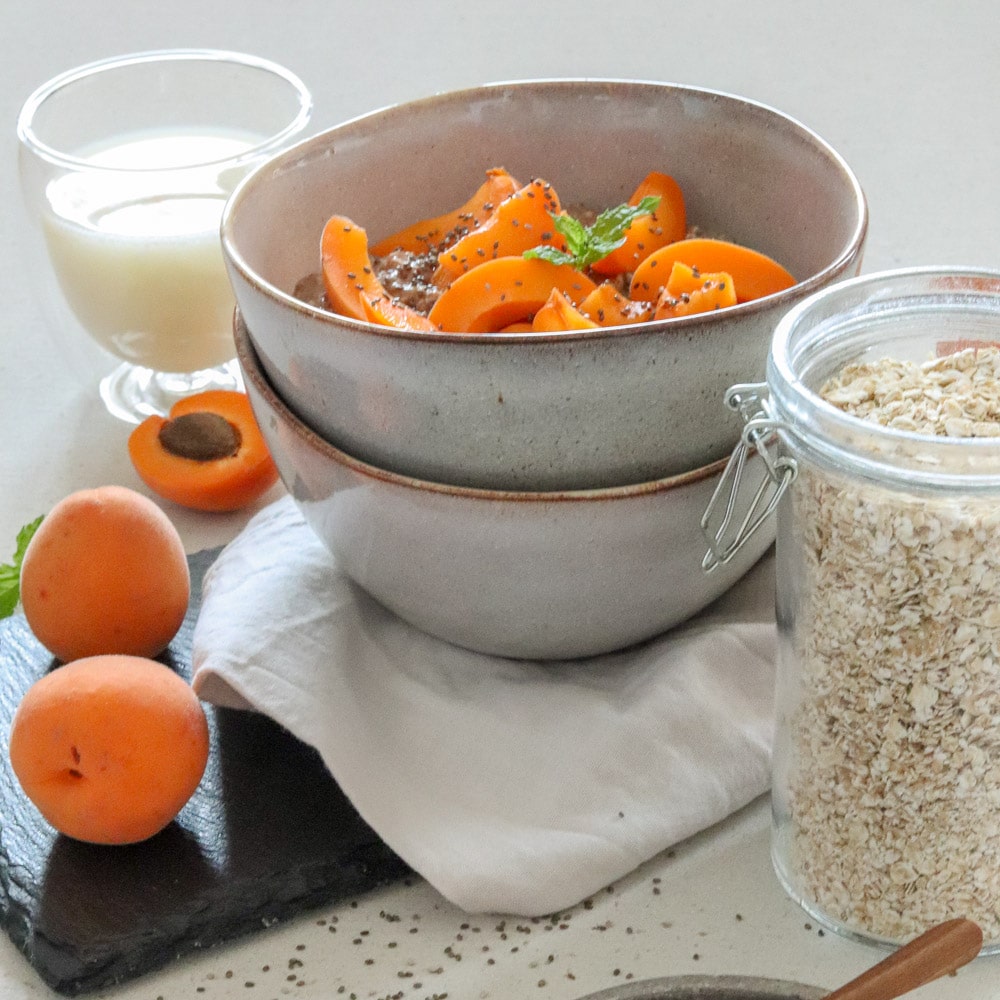 4. Am Morgen das Porridge in eine Schüssel geben auf Zimmertemperatur erwärmen lassen. Mit Marillenspalten garnieren.