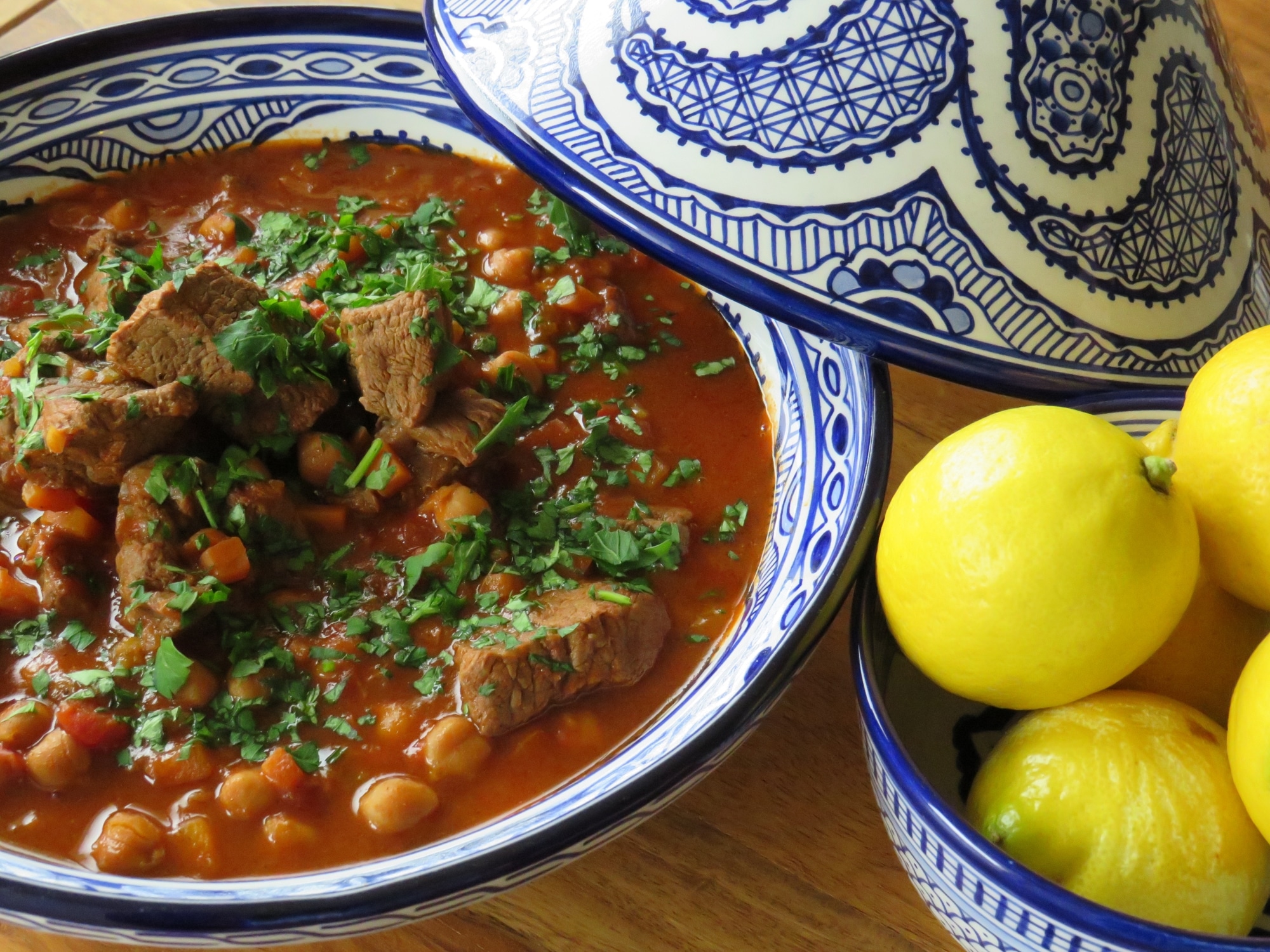 Olivenöl in einem großen Topf erhitzen. Petersilienblätter abzupfen und die Stängel fein hacken. Gemüse, Knoblauch, Ingwer und Petersilienstängel leicht glasig dünsten. Rindfleisch hinzugeben und bei starker Hitze einige Minuten anbräunen. Alle Gewürze, Tomatenmark und Harissa dazugeben, gut umrühren und noch ca. 2 Minuten mitbraten. Mit Suppe aufgießen, Tomaten und Kichererbsen hinzufügen. Kurz aufkochen und dann auf kleiner Flamme ca. 1,5 Stunden köcheln lassen bis das Fleisch ganz zart ist und die Suppe die gewünschte Konsistenz hat.
