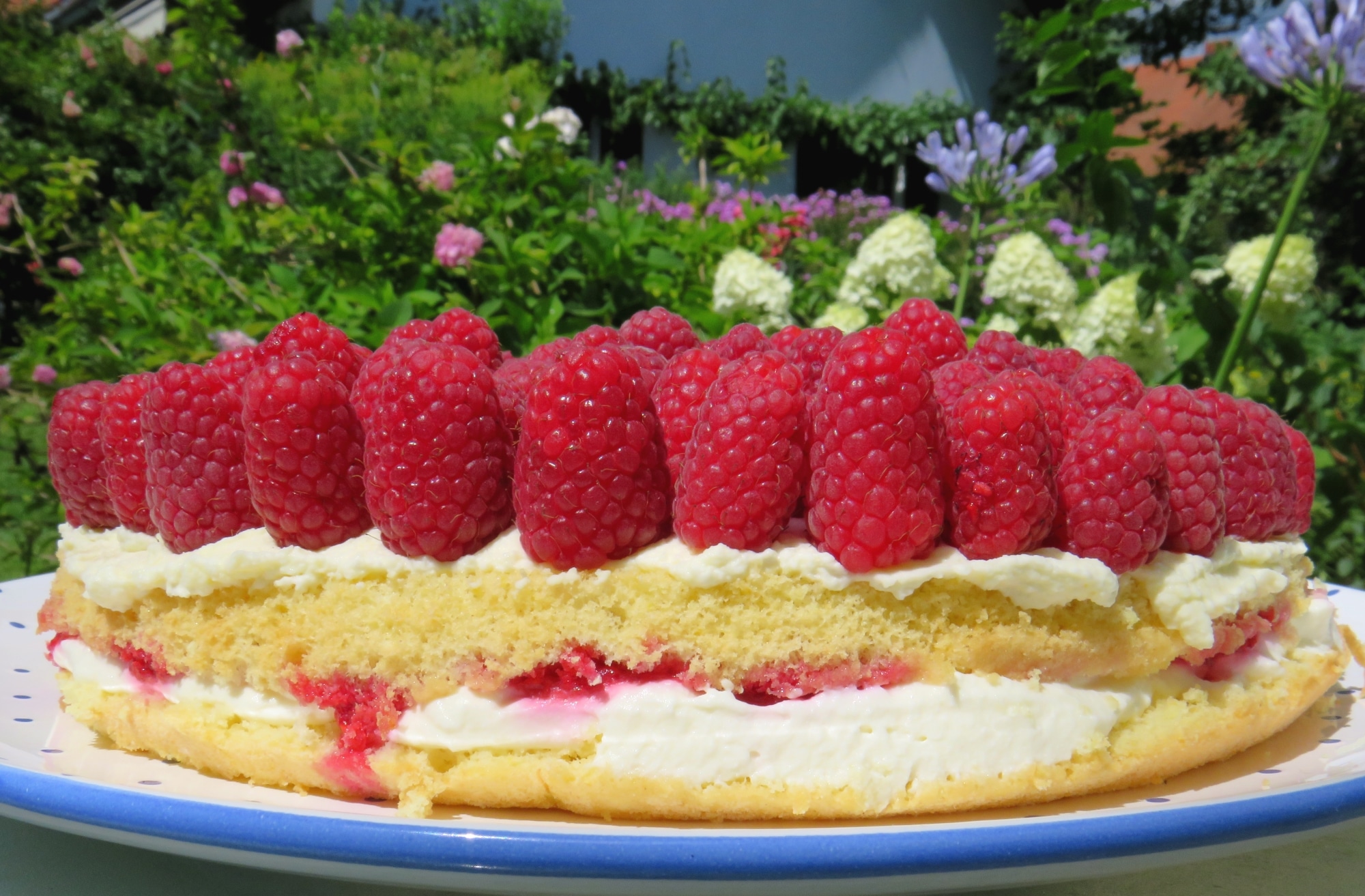 100g Himbeeren und 2 EL Staubzucker mit einem Stabmixer pürieren. Ricotta und 30g Staubzucker verrühren. Schlagobers steif schlagen und unter die Ricottamasse rühren. Den Biskuit der Länge nach durchschneiden. Die Hälfte der Creme auf die untere Scheibe Biskuit streichen. Das Himbeerpüree drauf verteilen und die obere Biskuitschicht vorsichtig daraufsetzen. Die restliche Creme darauf verteilen und mit Himbeeren verzieren.