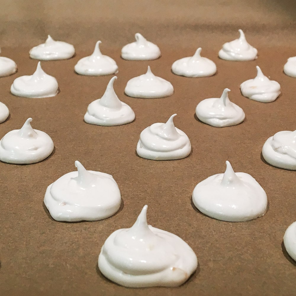 Den fein gehackten Ingwer unter die Baisermasse rühren und in einen Dressiersack füllen. Kleine Häufchen dressieren und mit einem Stück kandiertem Ingwer belegen. Im Rohr auf der mittleren Schiene (und darunter) für ca. 2 Stunden trocknen lassen. Die Baisers sind fertig, wenn sie nicht mehr weich sind und sich leicht vom Backpapier lösen lassen.
