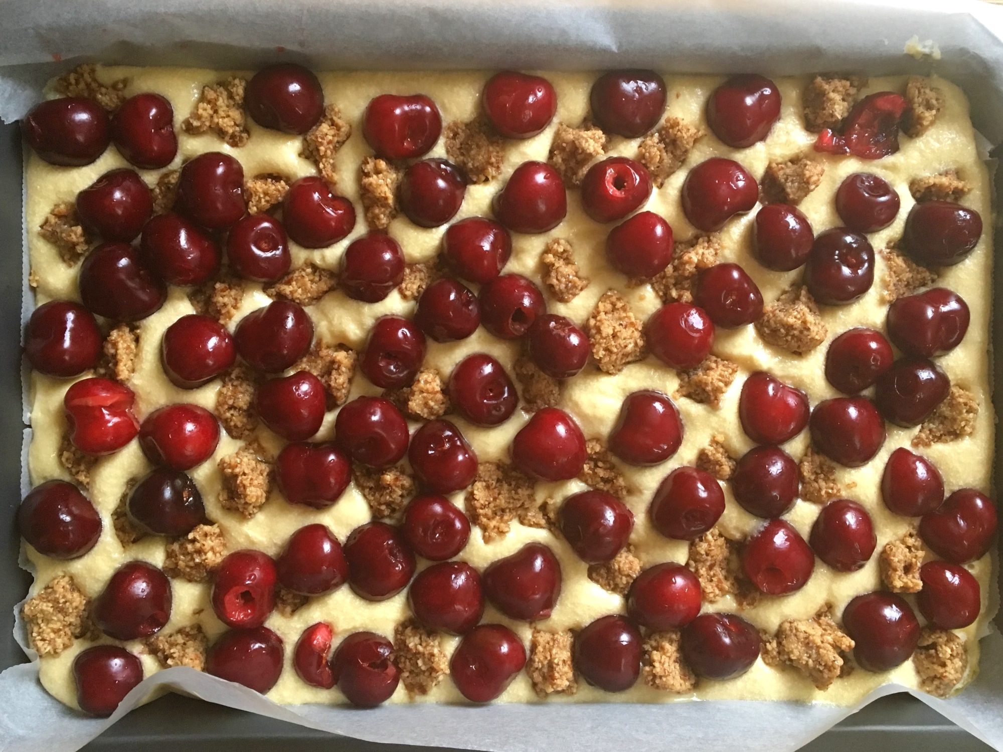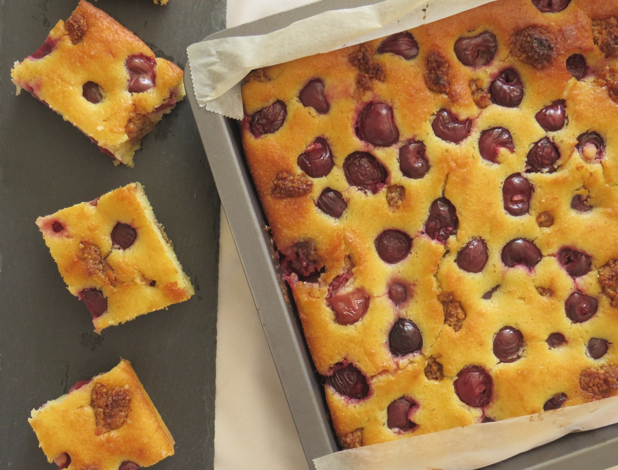 Was eignet sich besser als Proviant für einen ausgedehnten Badetag als ein saftiger Obstkuchen! Bei diesem Kirschkuchen handelt es sich zugegebenermaßen um eine ganz schöne Kalorienbombe, aber das eingebackene Mandelkaramell verleiht dem Kuchen einfach das gewisse Etwas.