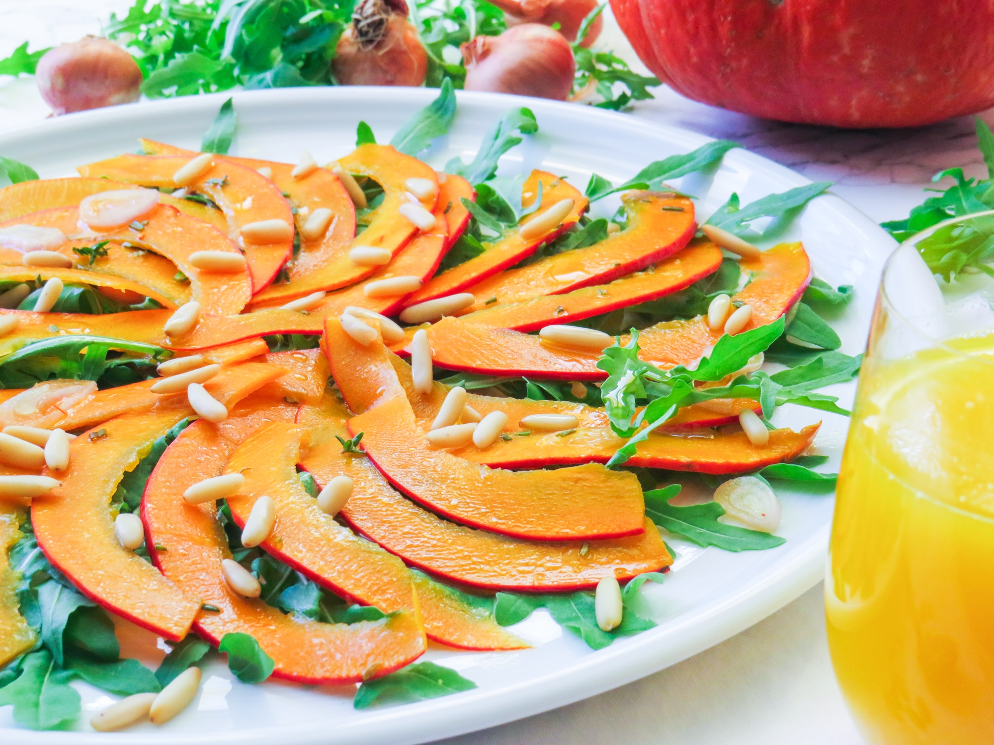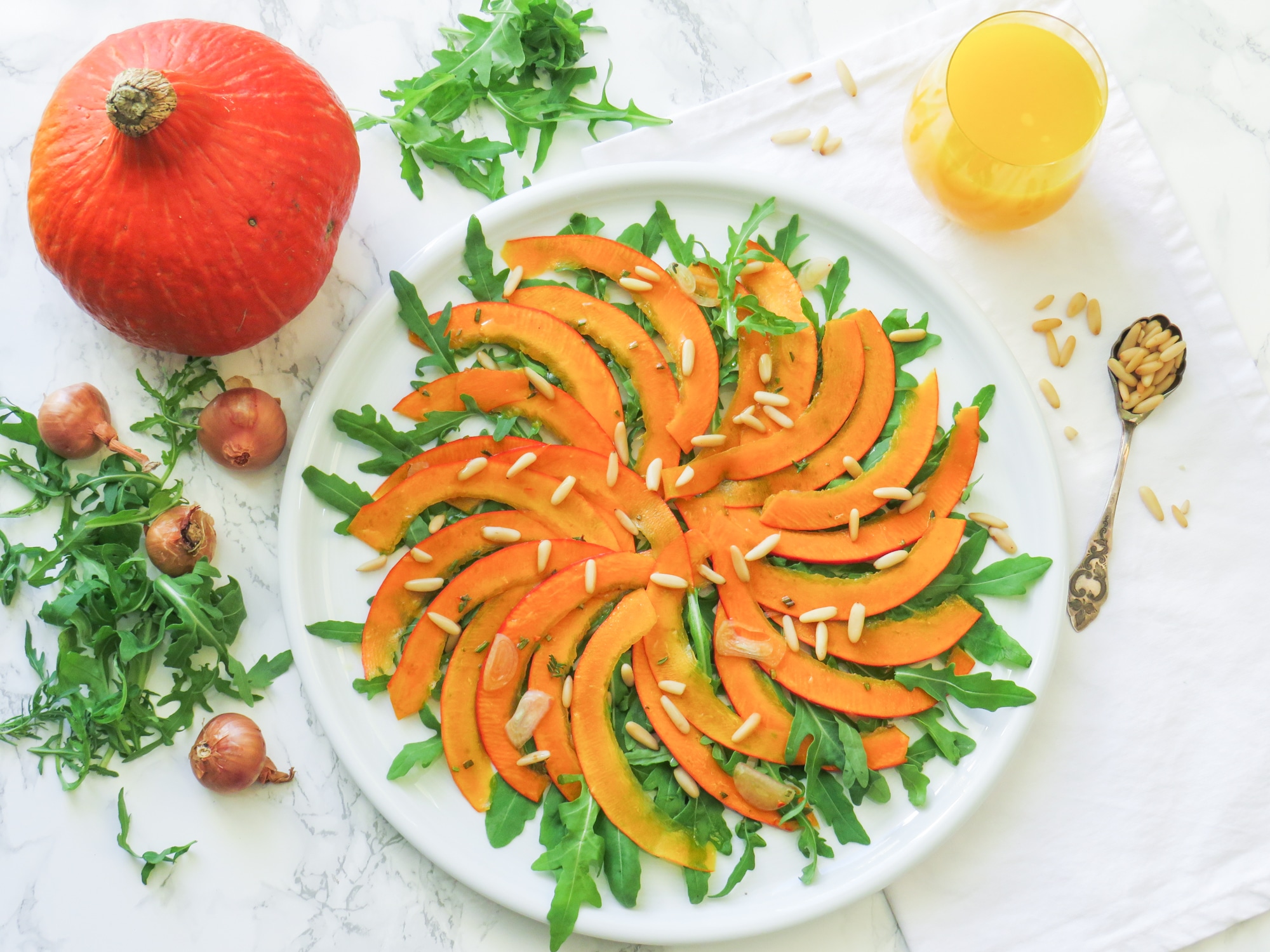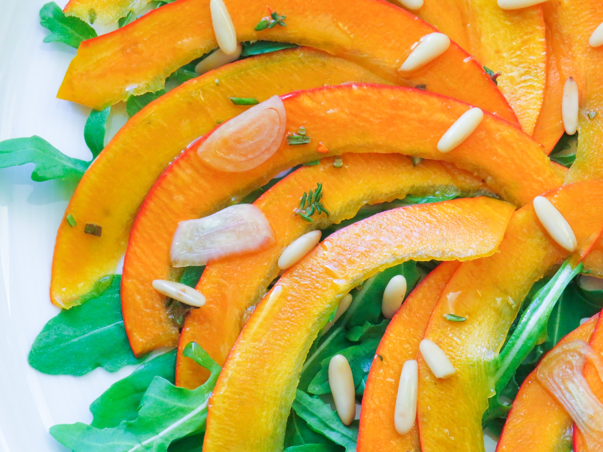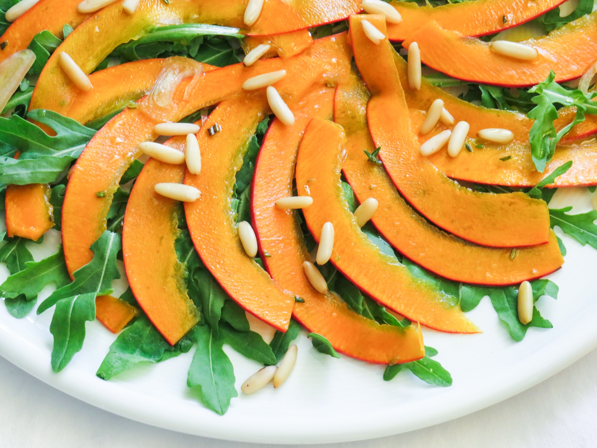 Kürbis-Carpaccio mit Rucola und Pinienkernen