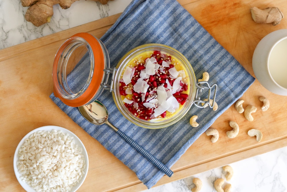 1. Den Milchreis mit Pflanzenmilch und Kurkuma in einem kleinen Topf aufkochen und dann bei schwacher Hitze für ca. 25 Minuten köcheln lassen.