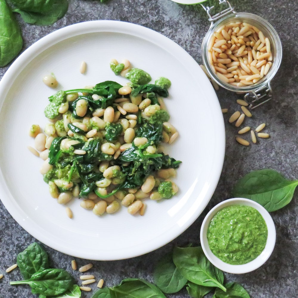 Nun zum heutigen Gericht: Es gibt einen lauwarmen Salat aus weißen Bohnen und Blattspinat, der mit einem frischen Basilikum-Pesto und Zitronensaft aufgepeppt wird. Das praktische an diesem Rezept ist, dass man die Zutaten beliebig abwandeln kann und dadurch immer neue Varianten des Gerichtes zubereiten kann. Statt weißen Bohnen könntest du Kichererbsen oder Kidneybohnen verwenden. Anstelle von Basilikum kannst du das Pesto einfach aus Koriander oder Petersilie machen. Und die Pinienkerne können durch Walnüsse oder Cashewkerne ersetzt werden. Der kulinarischen Fantasie sind also keine Grenzen gesetzt! Verwende einfach,was du gerade vorrätig hast oder worauf du Lust hast!