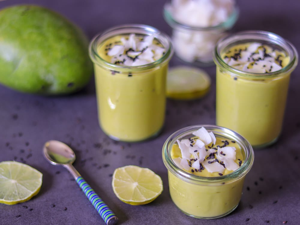 Die Mango-Avocado-Creme in Gläschen füllen und mit Sesam und Kokoschips bestreuen.