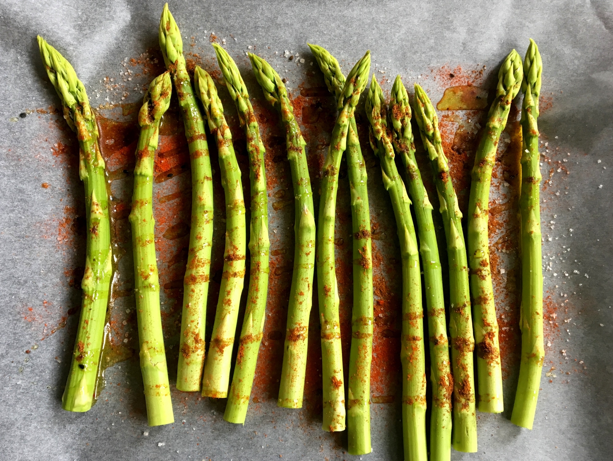 Backrohr auf 200 Grad vorheizen. Spargel waschen und die Enden abschneiden. Ein Backblech mit Backpapier belegen und den Spargel darauf verteilen. Mit Olivenöl beträufeln und mit der Gewürzmischung, Paprikapulver, Salz und Pfeffer bestreuen. Den Spargel wenden bis er gleichmäßig mit Olivenöl und Gewürzen umhüllt ist. Für ca. 12 Minuten im heißen Backrohr braten bis der Spargel leicht gebräunt ist.