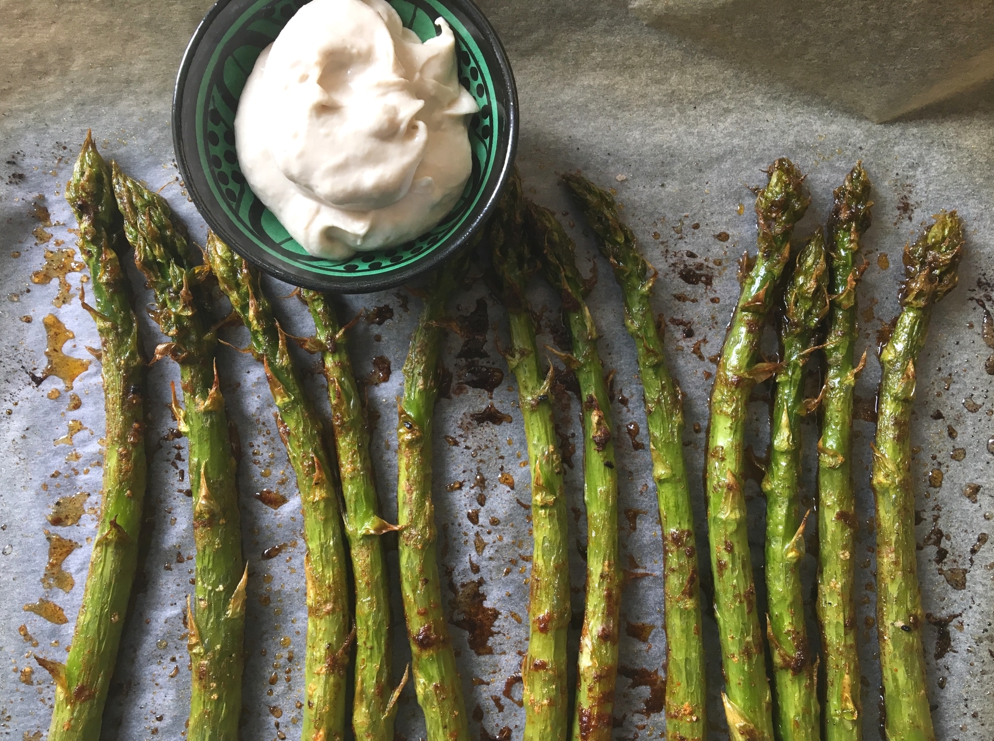 Spargel aus dem Ofen nehmen und zusammen mit dem Dip servieren.