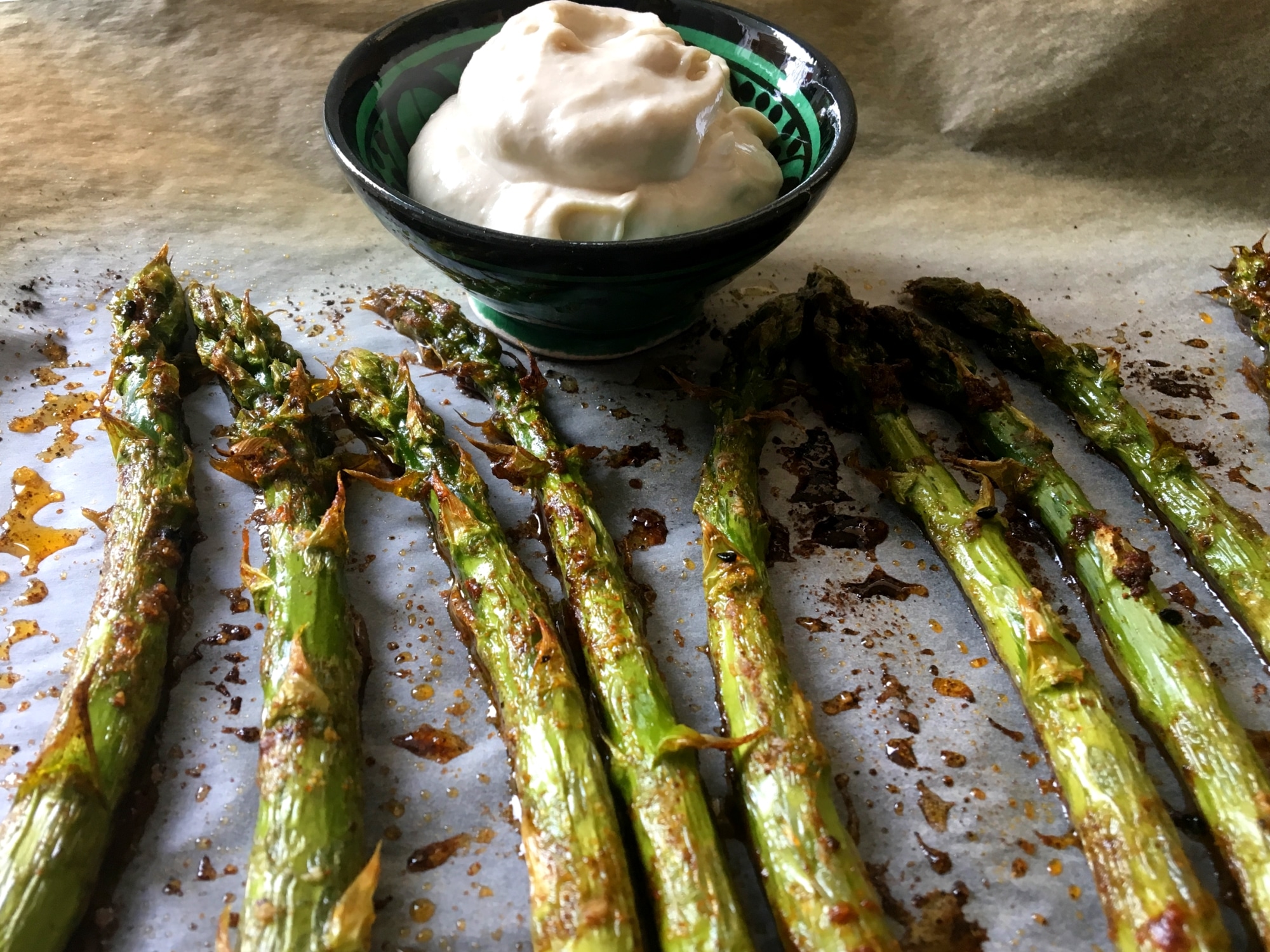 Endlich ist es so weit und der erste heimische Biospargel ist erhältlich. Zum Start in die Spargelsaison habe ich für euch ein Rezept für orientalisch gewürzten Ofenspargel als Snack für Zwischendurch oder als Teil eines arabischen Mezze Buffets. Dazu gibt es einen leckeren Dip aus Tahina und Joghurt, der perfekt zum würzigen Spargel passt.