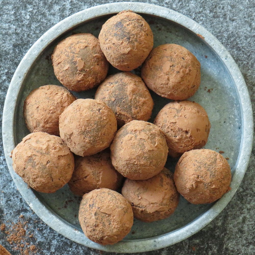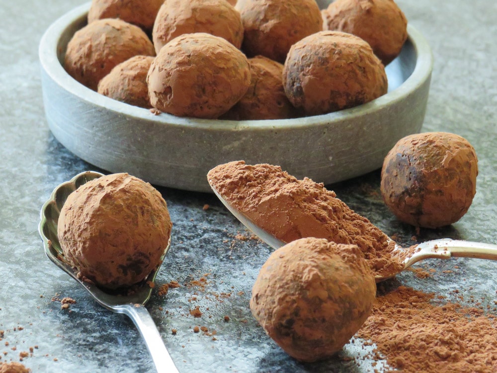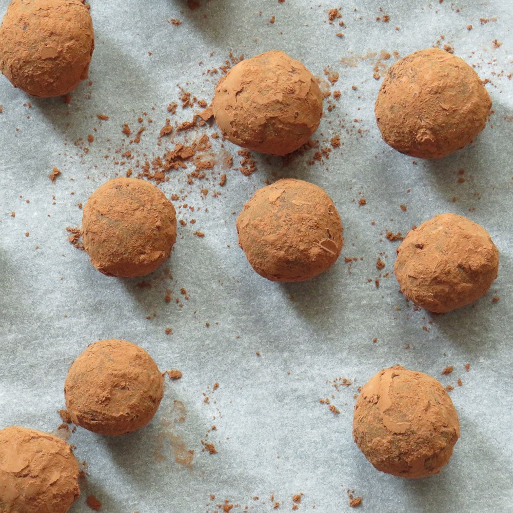 Aus der Masse kleine Kugeln formen und auf ein beschichtetes Backblech setzen. Für einige Stunden oder über Nacht kalt stellen.
