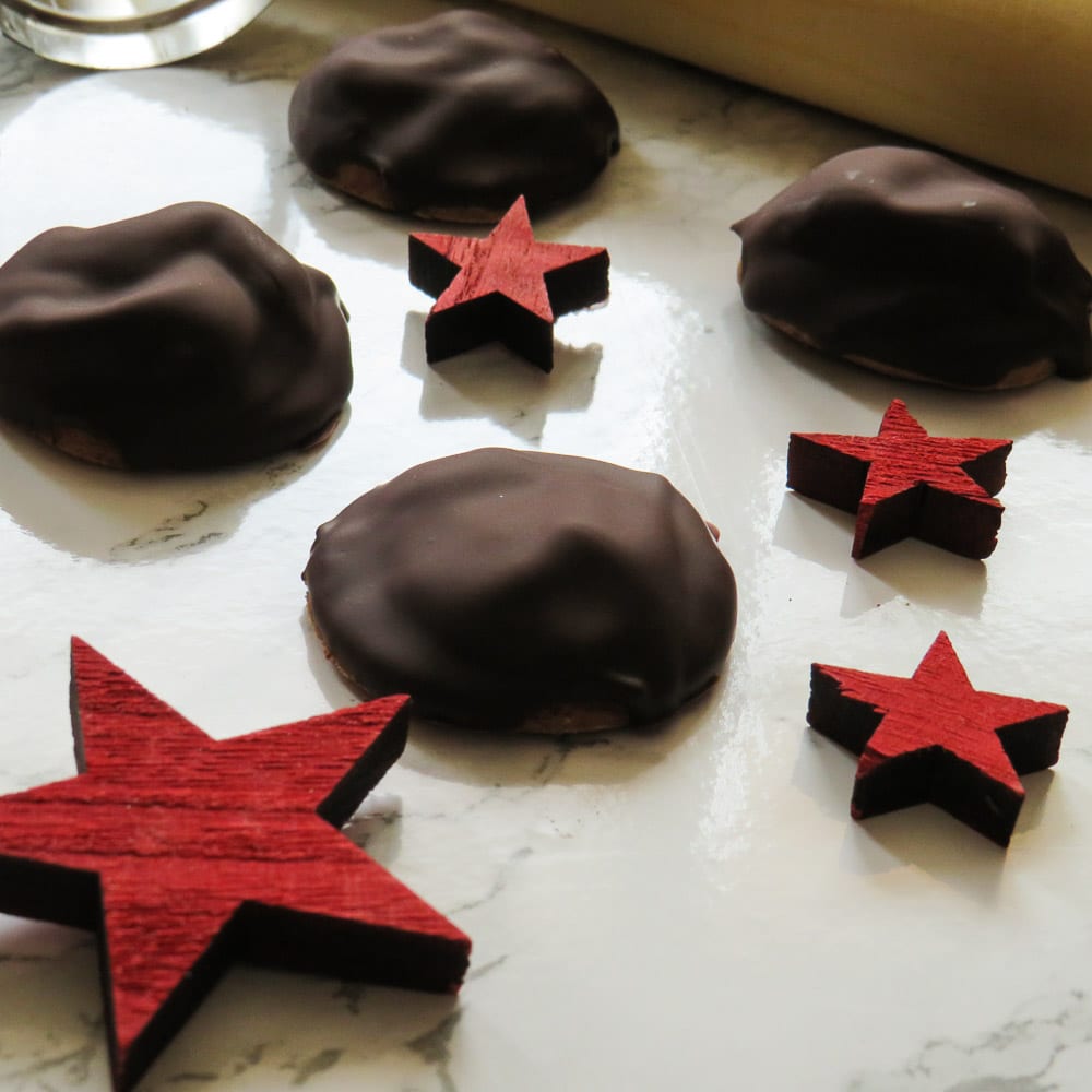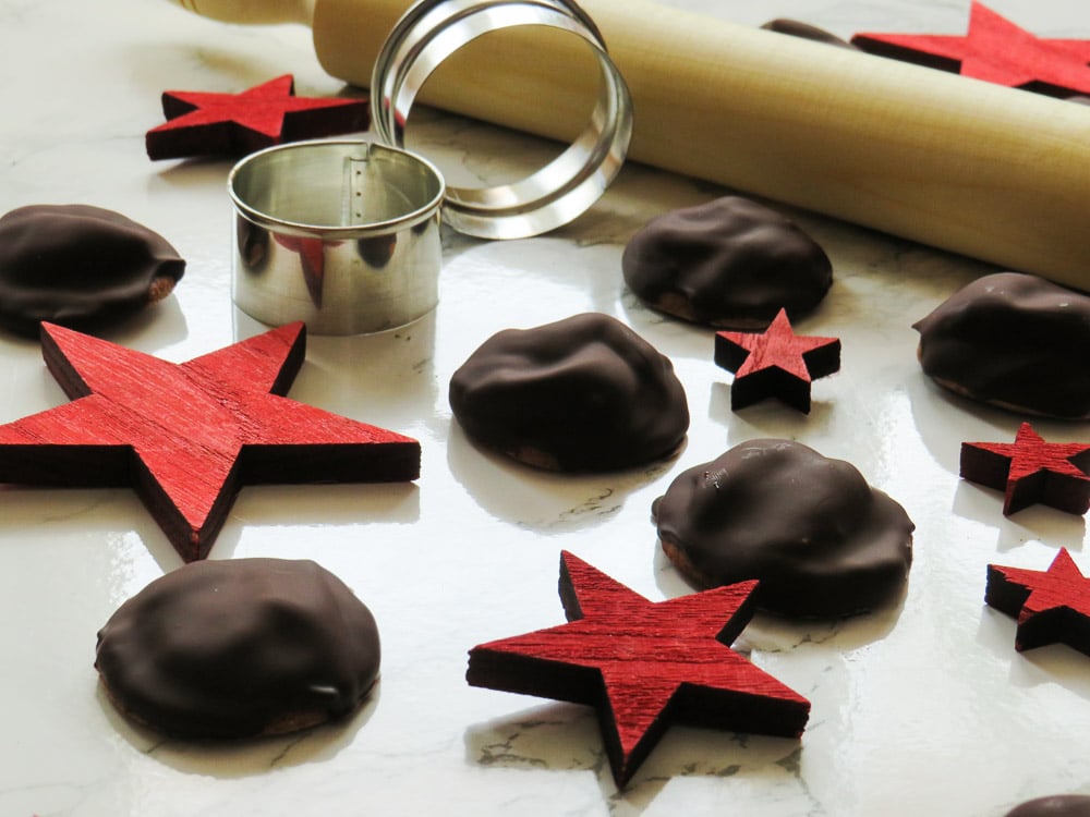 3. Lebkuchenteig portionsweise ausrollen und mit einem kreisrunden Ausstecher (4 cm Durchmesser) Scheiben ausstechen. Auf das Backblech legen und im Rohr für ca. 8 Minuten backen. Lebkuchen aus dem Rohr nehmen und auskühlen lassen.