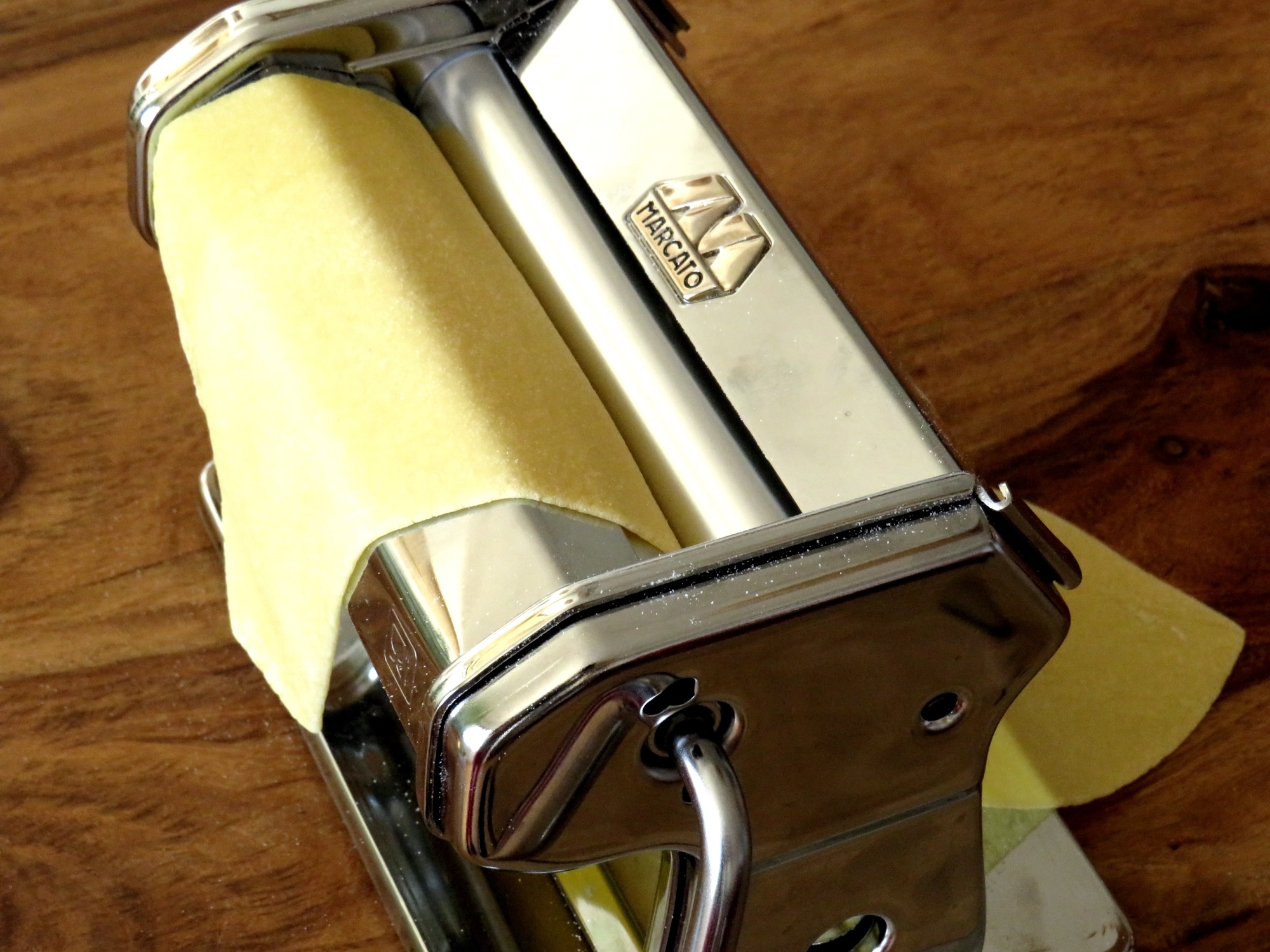 Nach kurzer Internetrecherche war klar, dass ich mich für den italienischen Klassiker Marcato Atlas 150 Wellness entscheiden würde und wenige Tage später stand dieser dann auch schon in meiner Küche. Das Modell hat drei Walzen für die Herstellung von Teigplatten (für Lasagne oder zur Weiterverarbeitung als Ravioli etc.), Fettuccine und Tagliolini. Mit zusätzlichen Aufsätzen könnte man das Repertoire der Maschine noch erweitern.