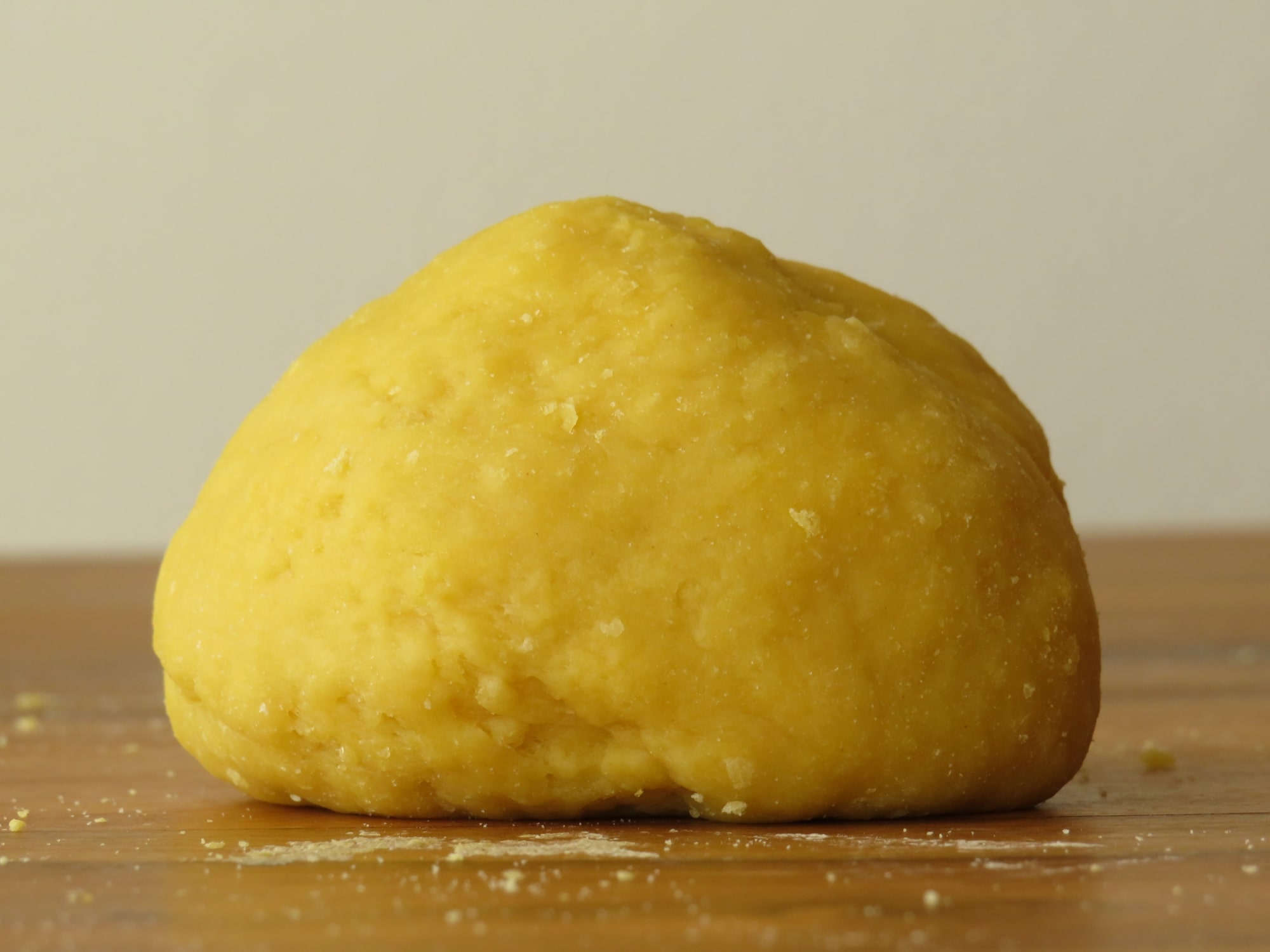 [df_divider_text title=“Zubereitung“ title_align=“separator_align_left“ el_width=“100″ style=“solid“ height=“1px“ accent_color=“#EEEEEE“ border_size=“1px“ padding=“22px 0″ position=“align_center“ el_class=““]Die Zutaten zu einem Teig verkneten und so lange weiterkneten, bis das gesamte Mehl in den Teig eingearbeitet ist. Sollte die Masse zu trocken sein, kann man zwischendurch die Hände befeuchten und dann einfach weiterkneten. Nach etwa 5 Minuten sollte man einen geschmeidigen Teig vor sich haben, den man dann in Frischhaltefolie gewickelt mindestens eine Stunde im Kühlschrank rasten lässt.
