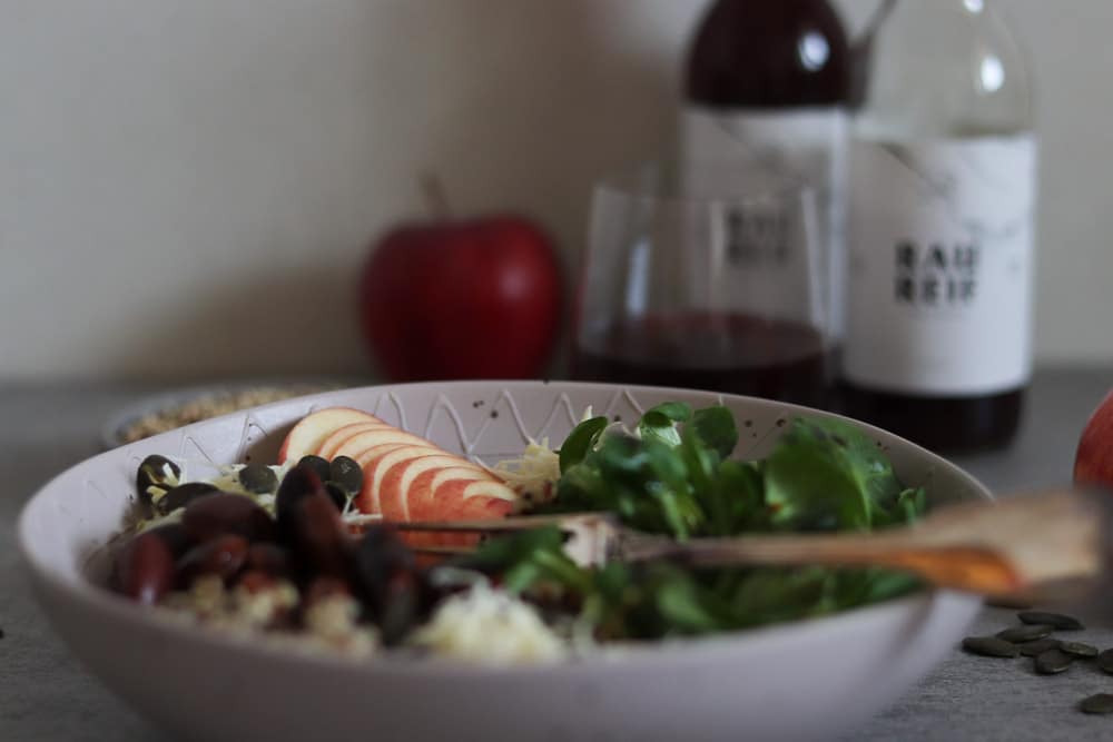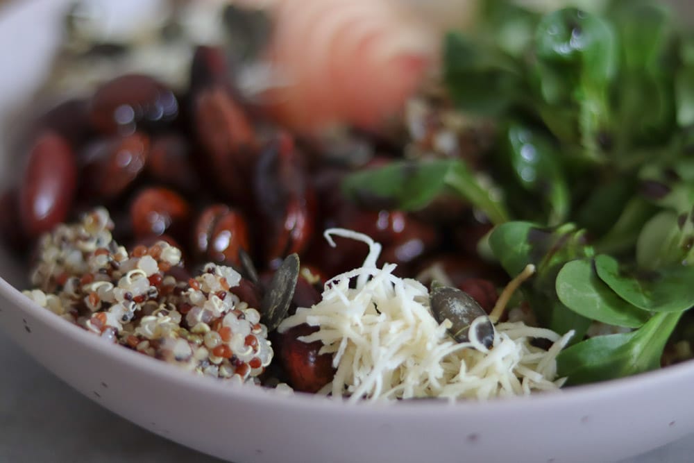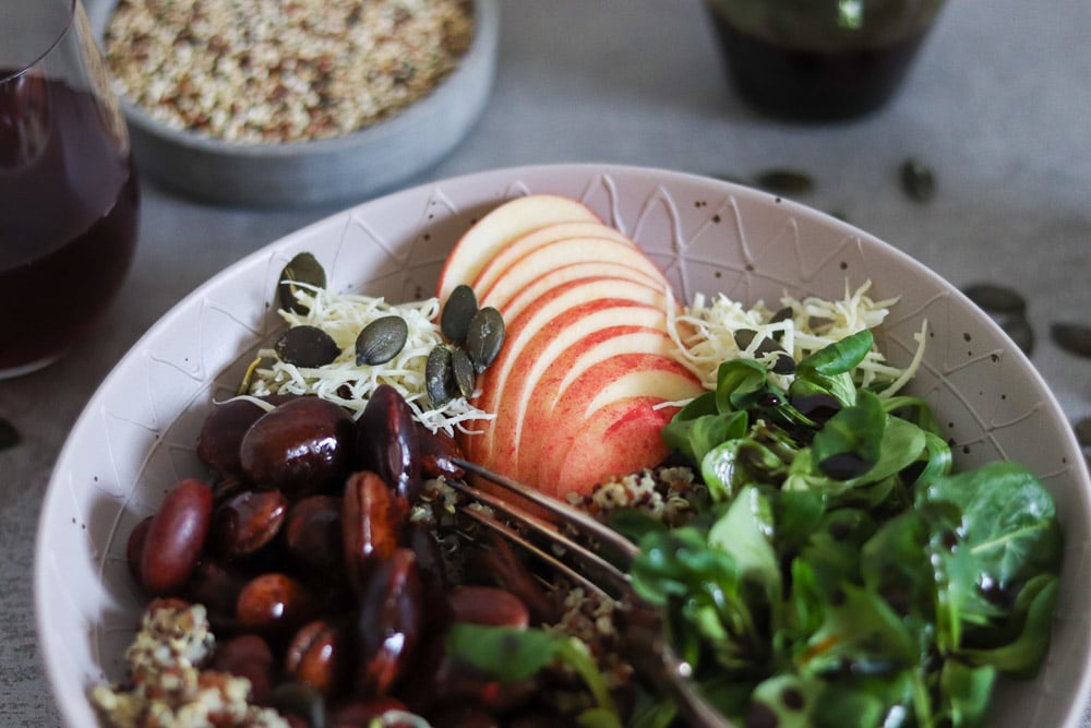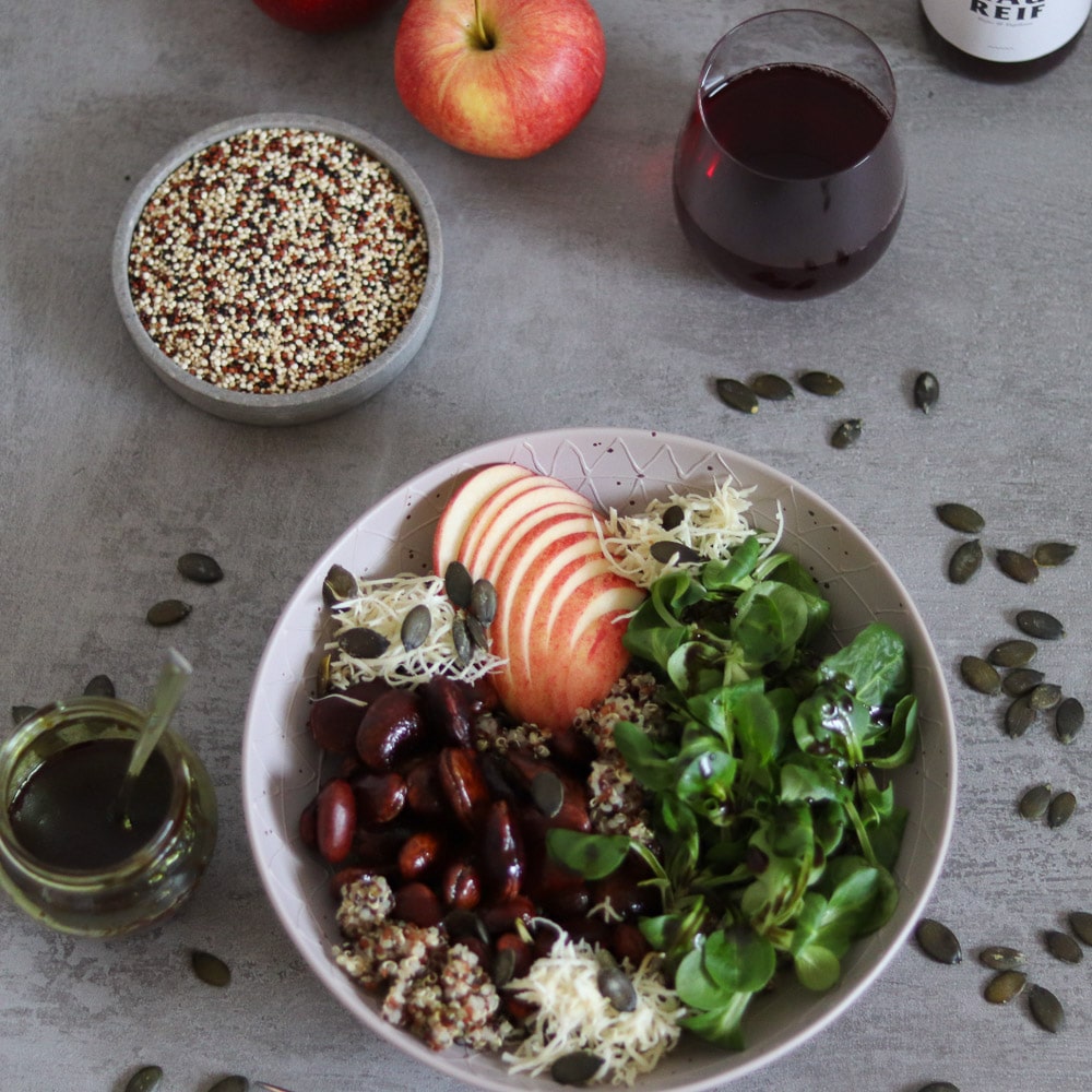 Quinoa Bowl mit steirischen Zutaten wie Käferbohnen, Vogerlsalat, Kren, Apfel und Kernöl