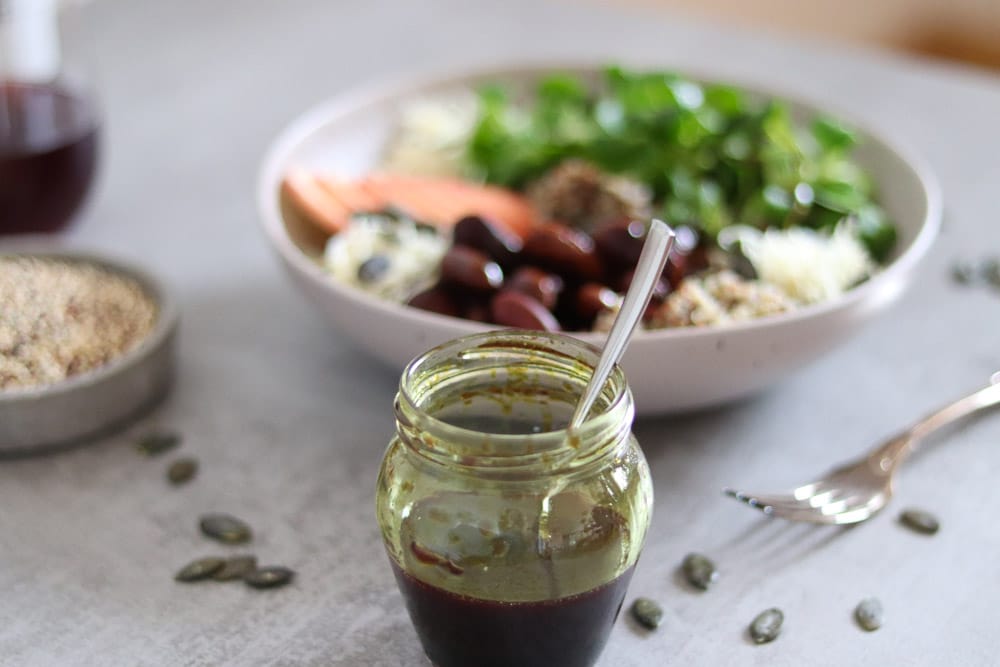 4. Kürbiskernöl, Apfel Balsamico, Agavendicksaft und eine Prise Salz zu einem Dressing verrühren.