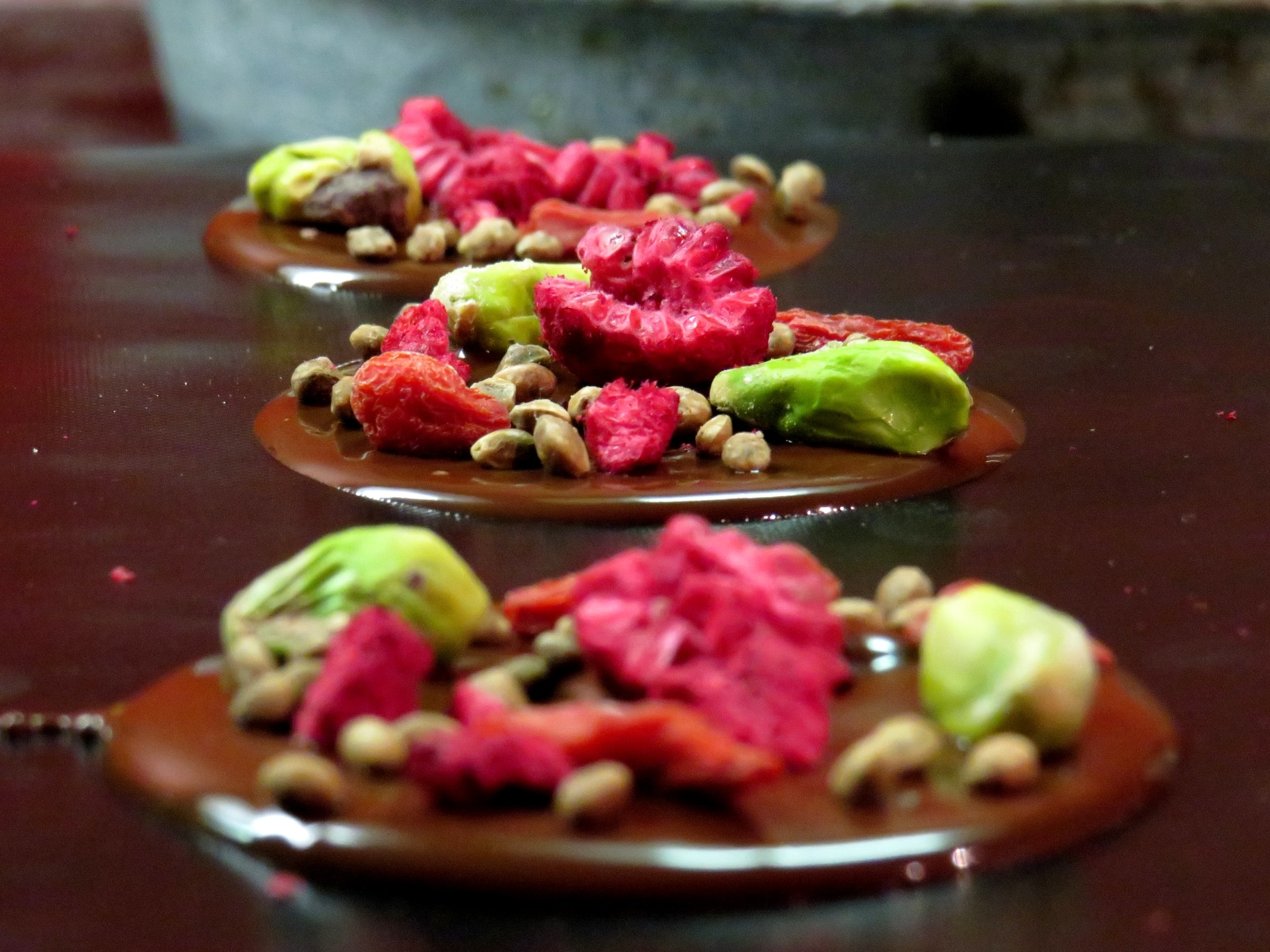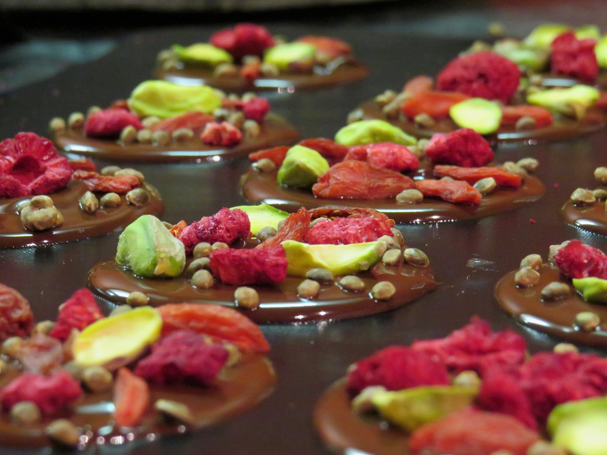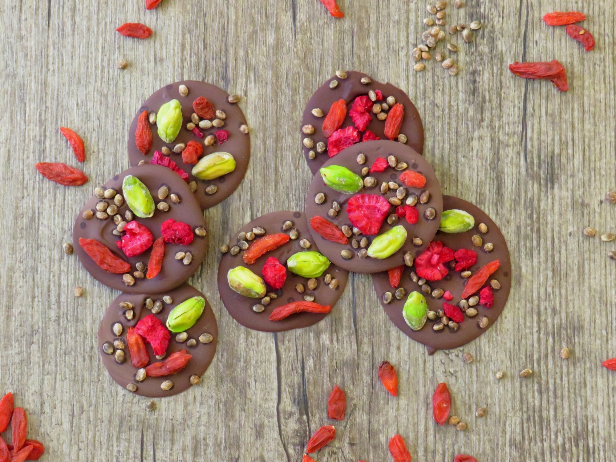 Auf Backpapier oder einer Silikonbackmatte mithilfe eines Esslöffels die Schokolade kreisförmig aufstreichen. Dann nach Belieben mit den Gojibeeren, Himbeerstücken und Pistazien belegen und am Ende noch ein paar Hanfsamen darüberstreuen.