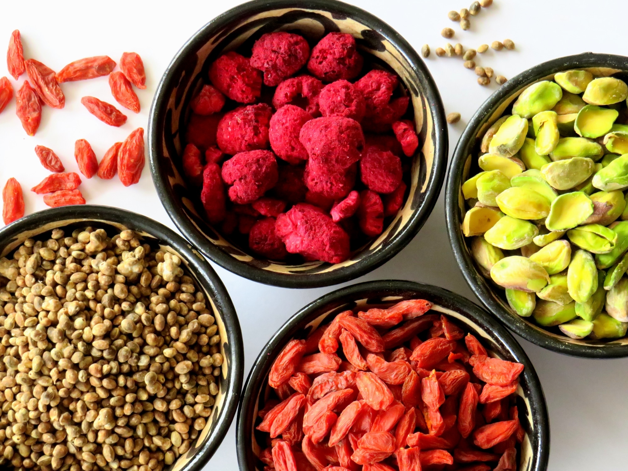 Zugegebenermaßen habe ich Pistazien wegen ihrer schönen giftgrünen Farbe verwendet. Doch in puncto gesundheitlicher Wirkung stehen sie den Gojibeeren in nichts nach. Denn auch sie sollen die Abwehrkräfte stärken und sind noch dazu reich an Vitamin E und Folsäure.